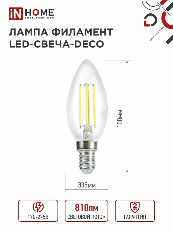Лампа светодиодная филаментная лампочка LED-СВЕЧА-deco, 9Вт, 230В Е14 4000К 1040Лм, прозрачная, IN HOME (4690612026206)