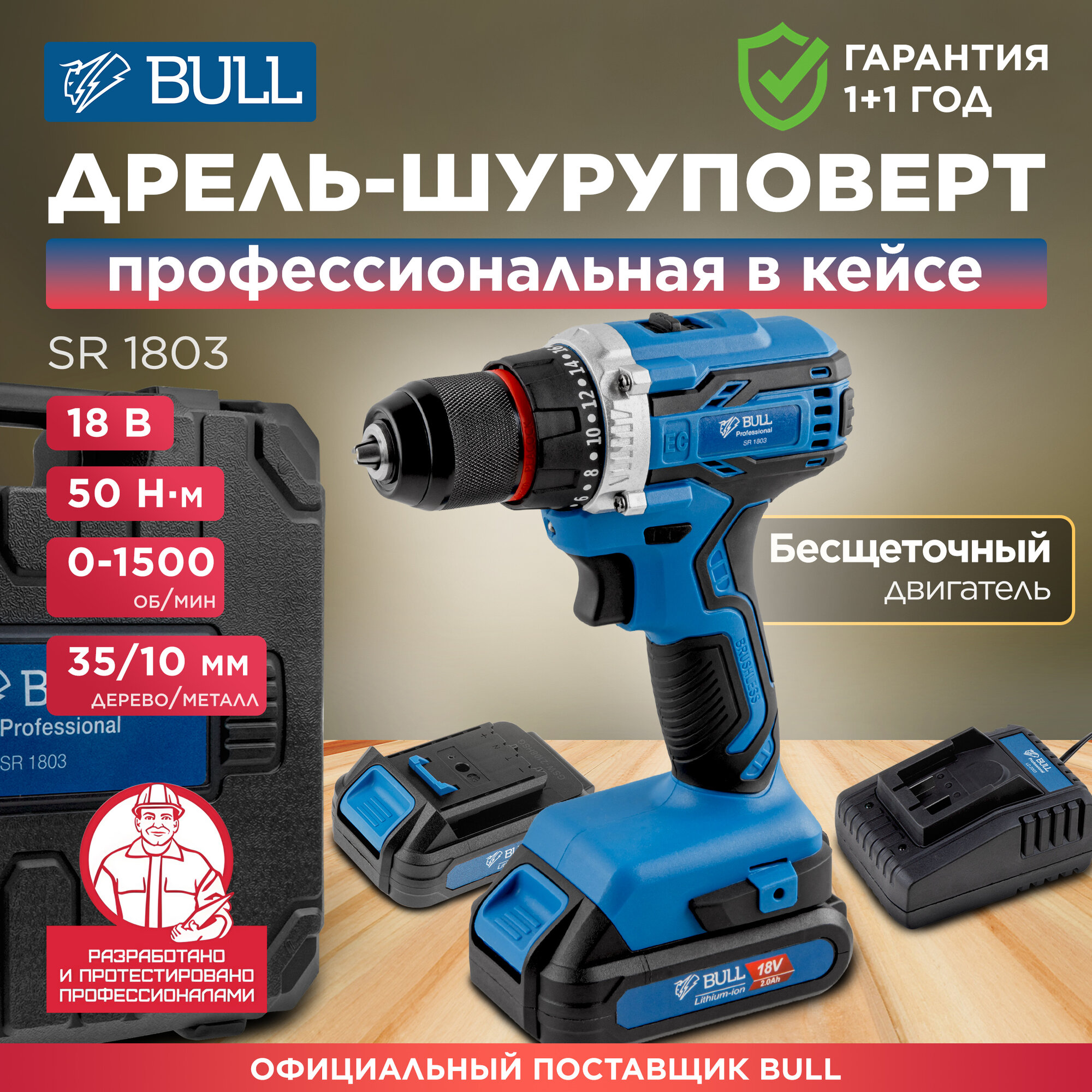 Дрель-шуруповерт аккумуляторная BULL SR 1803 с АКБ и ЗУ (0329105)