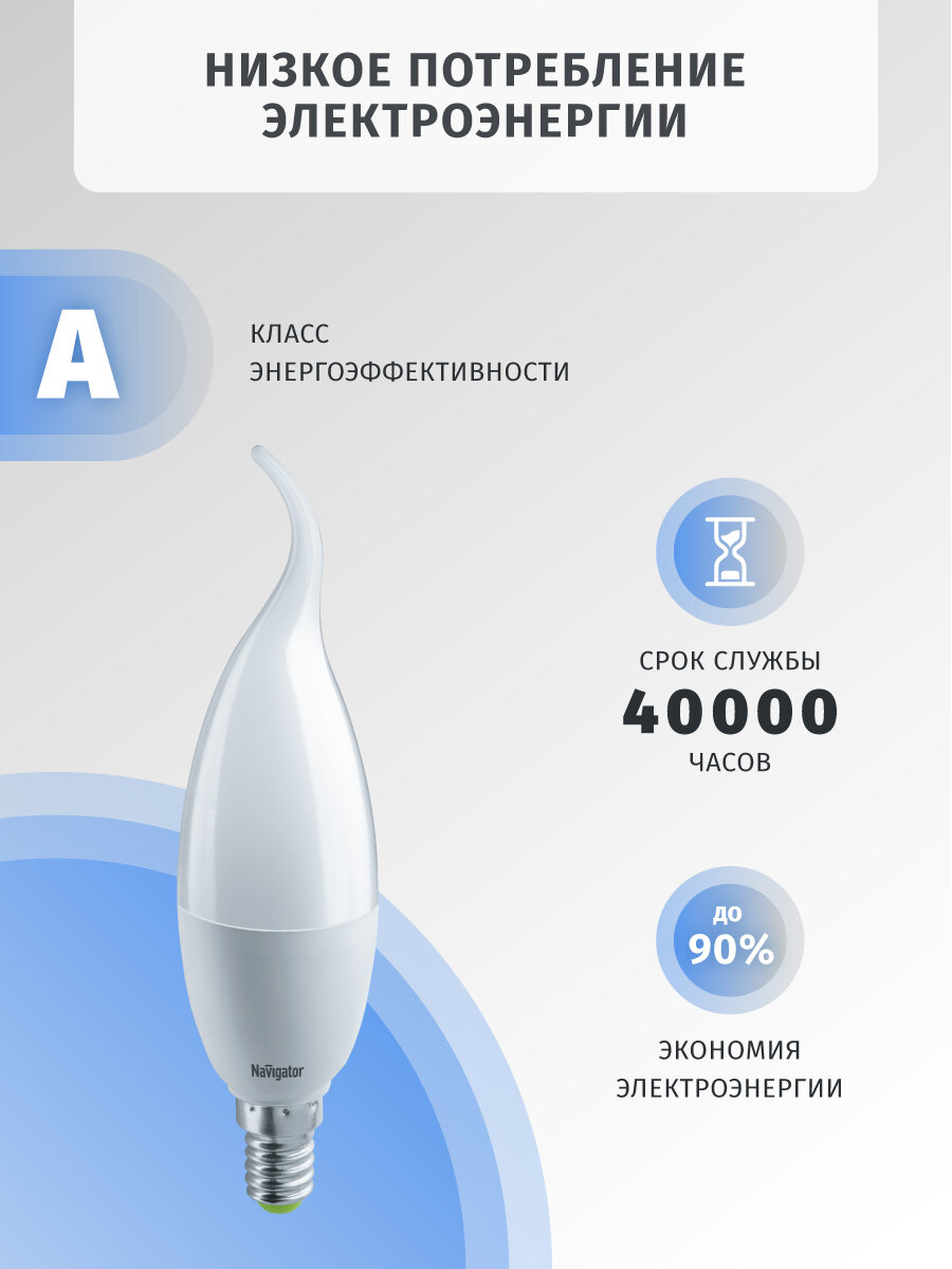 Светодиодная лампа Navigator 61 331, 8.5 Вт, свеча на ветру Е14, дневного света 4000К, упаковка 10 шт.