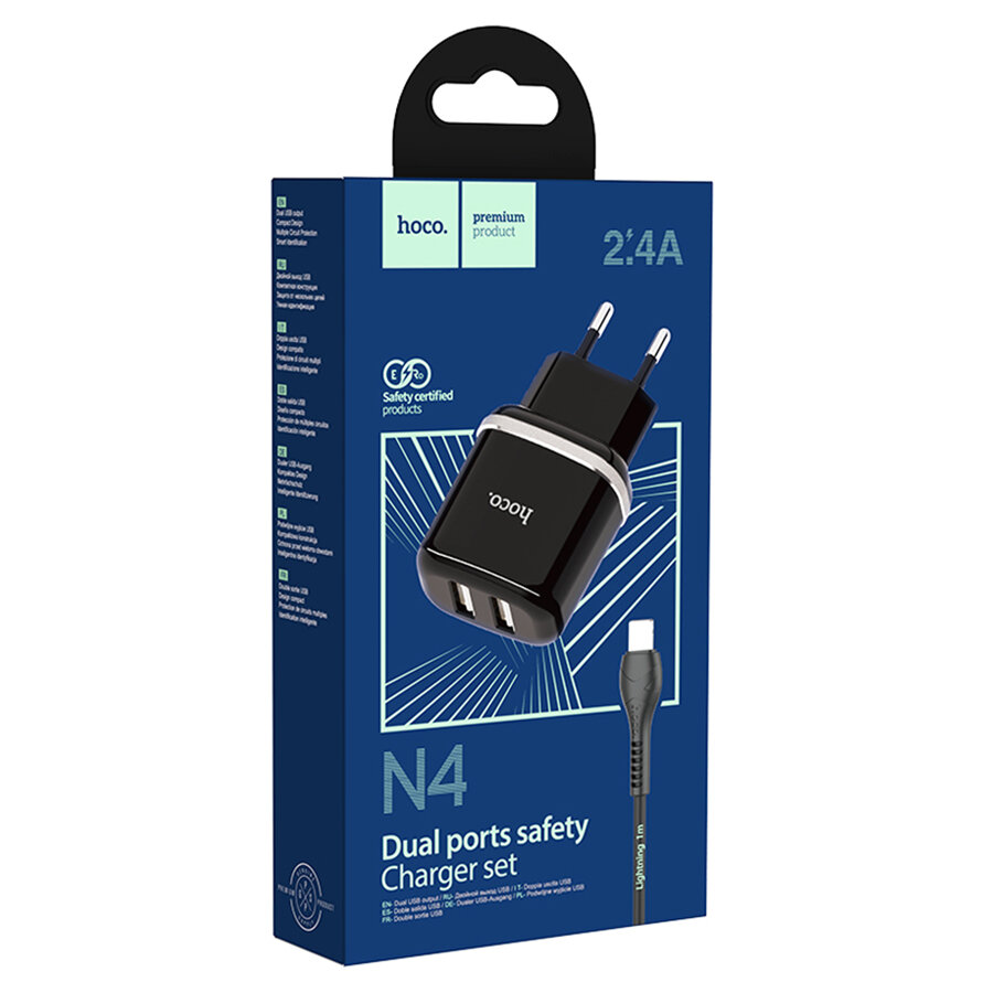 hoco N4 Aspiring зарядное устройство с двумя USB выходами 2.4A, с кабелем Lightning - черный