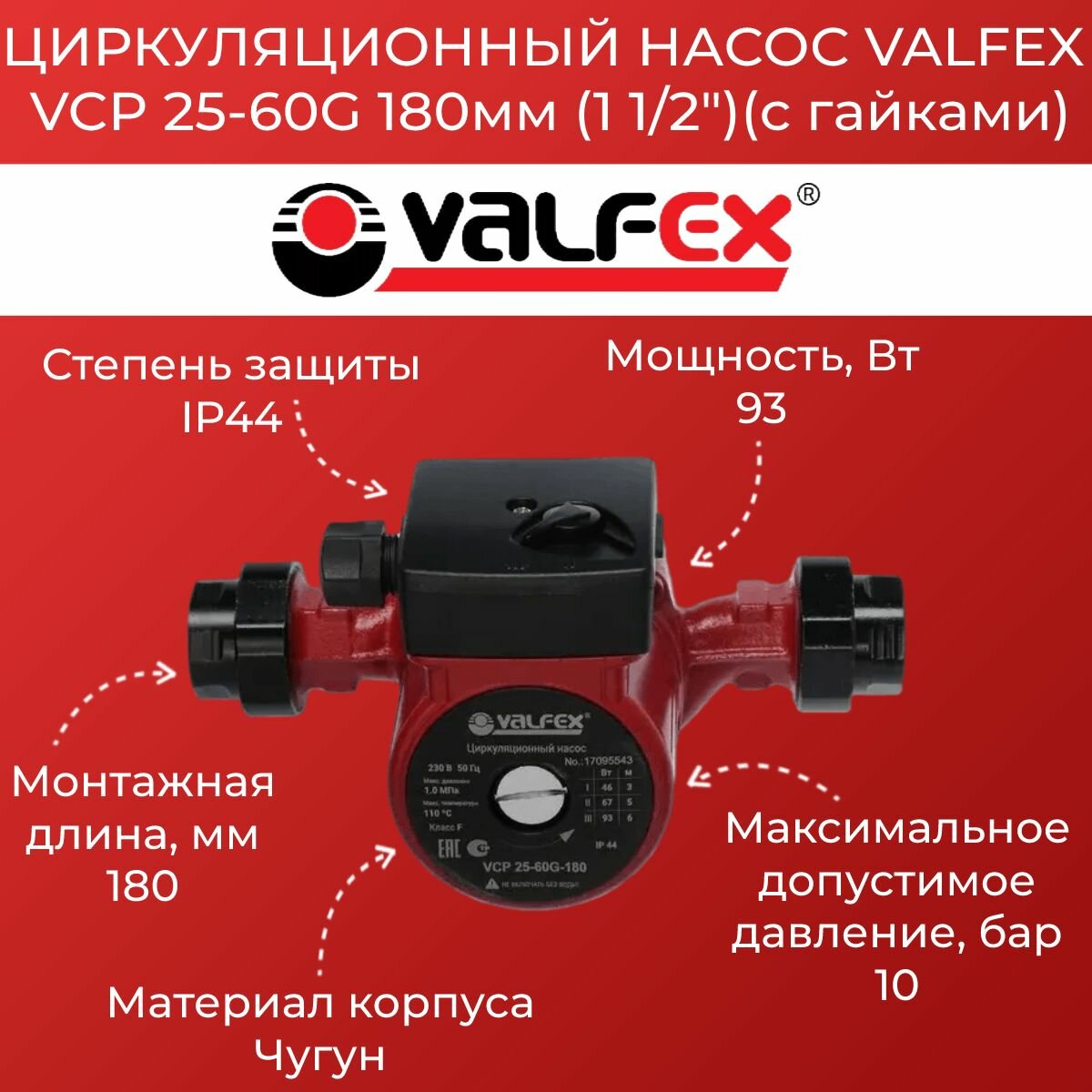 Купить Циркуляционный насос VALFEX (VCP 25-60G) 180 мм., с гайками
