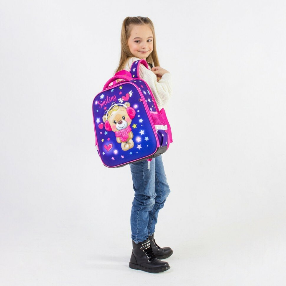 Ранец ортопедический школьный Brauberg для девочки, 2 отделения, smiling bear, 3d-панель, 38х27х14 см (270614)