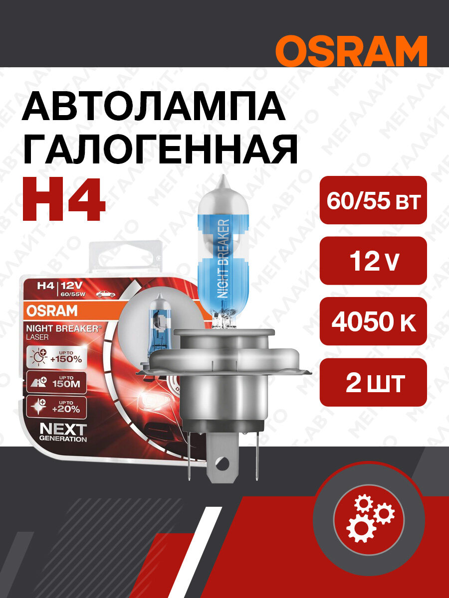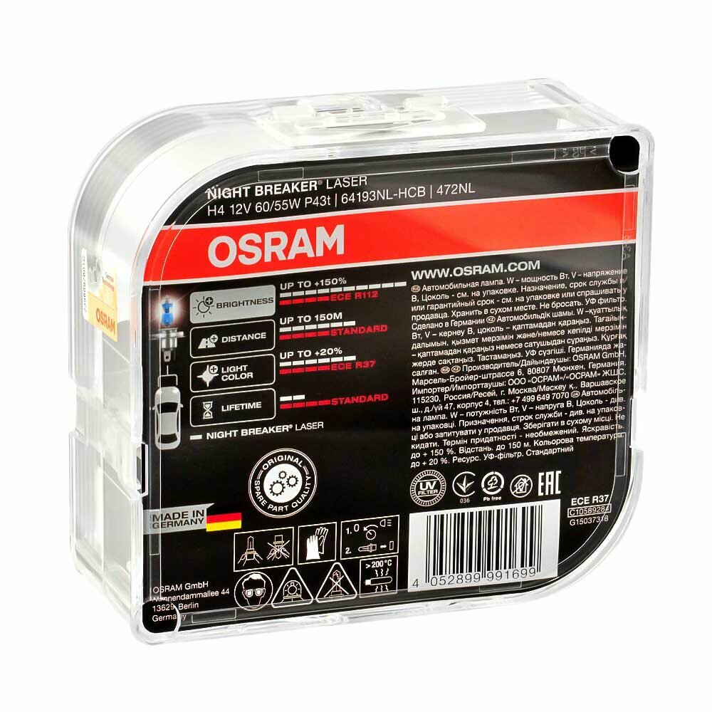 Галогенная лампа Osram H4 (60/55W 12V) Night Breaker Laser 2шт., c QR-кодом подлинности, 64193NL-HCB
