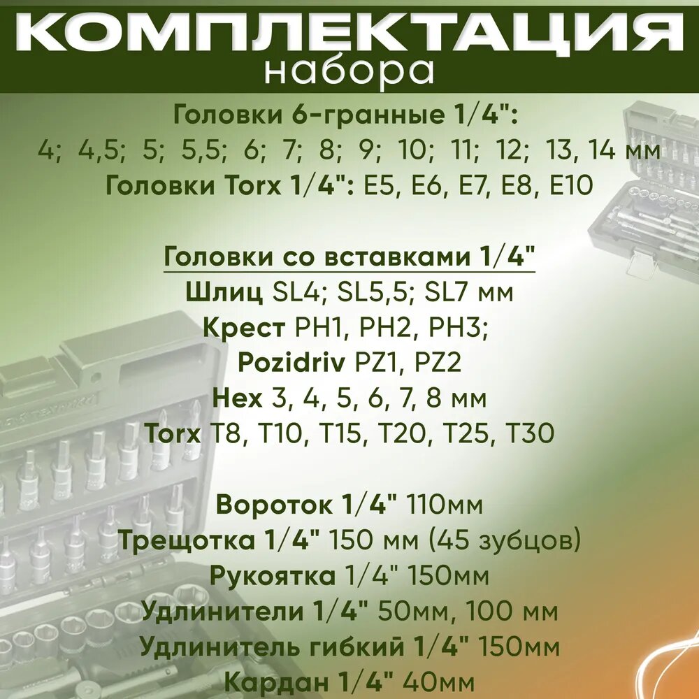 | Головки торцевые подробно | 1/4": 4, 4.5, 5, 5.5, 6, 7, 8, 9, 10, 11, 12, 13, 14 мм; 1/4": E5, E6, E7, E8, E10; с битами 1/4": SL4, SL5.5, SL7, PH1, PH2, PH3, PZ1, PZ2, PZ3, H3, H4, H5, H6, H7, H8, Т8, Т10, Т15, Т20, Т25, Т30, Т40; вороток т-образный 1/4": 110 мм; трещотка 1/4"; удлинитель 1/4": 50, 100 мм; гибкий удлинитель 1/4": 150 мм; карданный шарнир 1/4" |