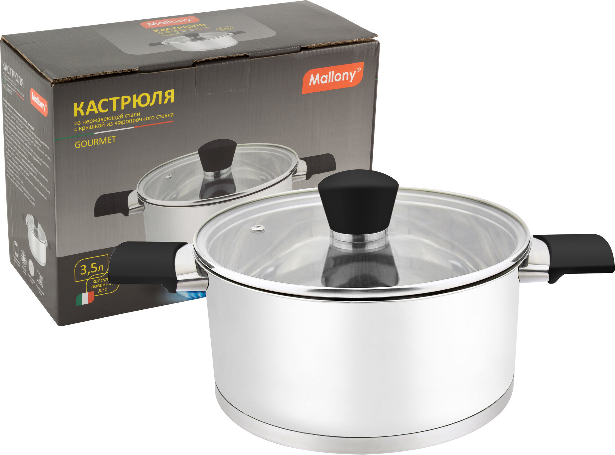 Mallony Кастрюля Gourmet,объем 3,5 л,из нержавеющей стали с крышкой из жаропрочного стекла,ручки с с .