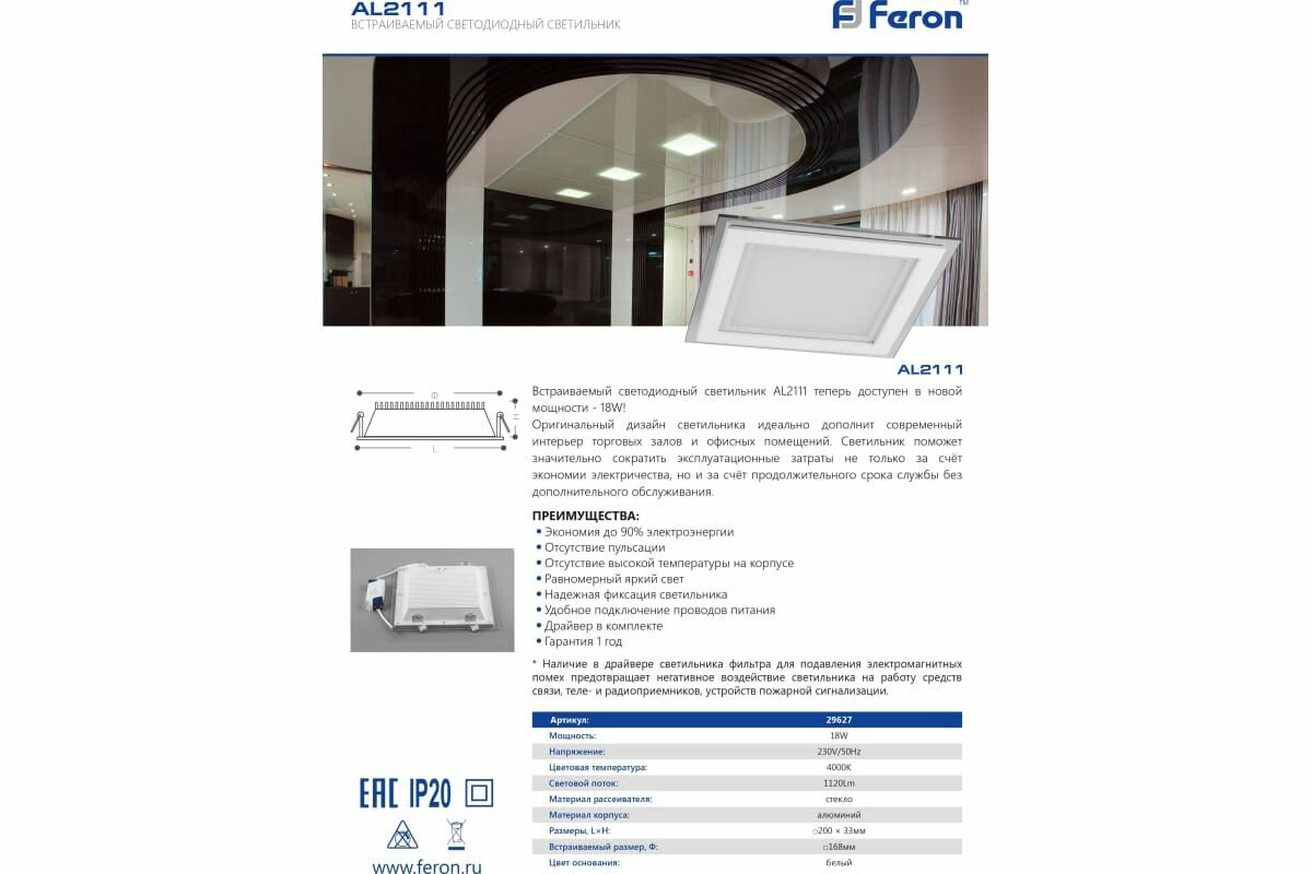 Светильник встраиваемый Feron светодиодный 18W, 1120Lm, 4000K, белый, AL2111 с драйвером в комплекте