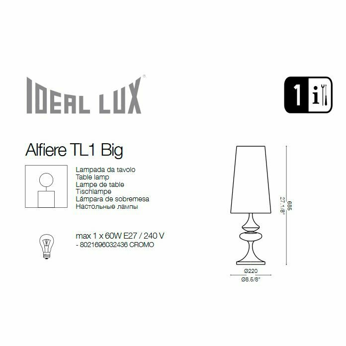 Лампа настольная ideal lux Alfiere TL1 Big макс.1х60Вт IP20 Е27 230В Хром Металл/ПВХ Выключатель Без лампы 032436.