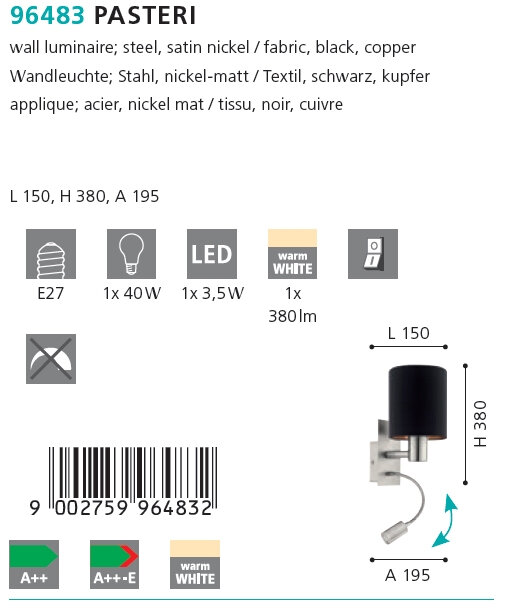 Светильник настенный PASTERI Eglo 96483, 150W, E27