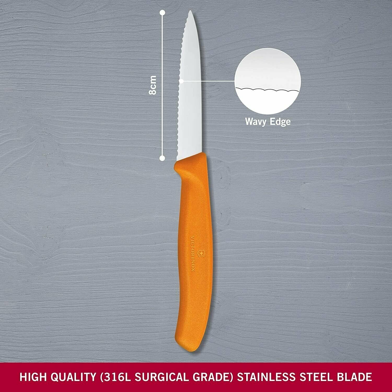 Нож для овощей VICTORINOX Swiss Classic, лезвие из нержавеющей стали 8 см, с волнистой кромкой, заострённый кончик, оранжевая рукоять (6.7636.L119)