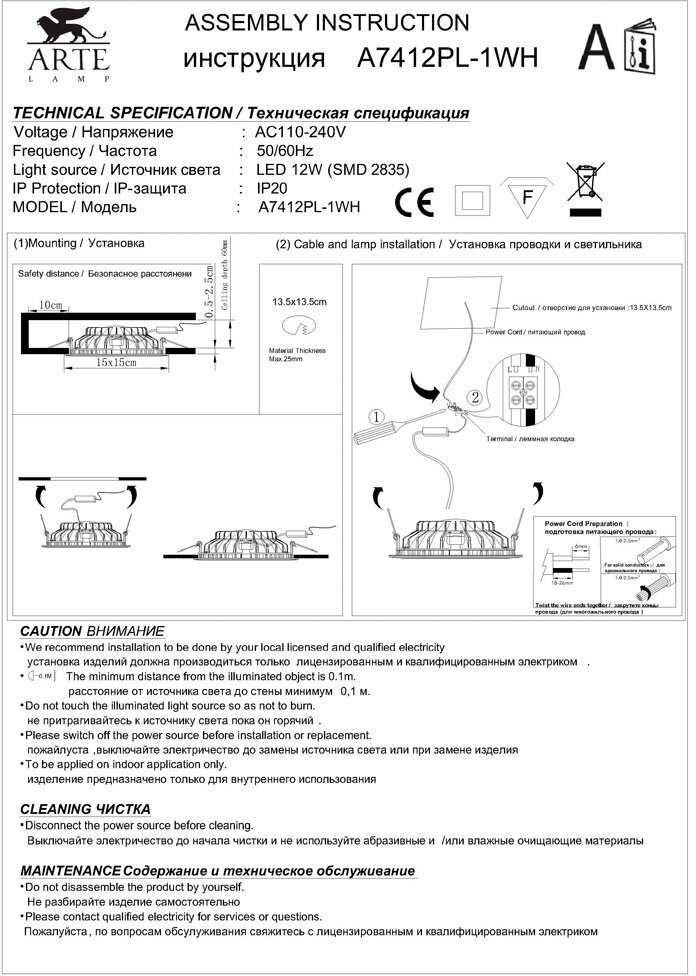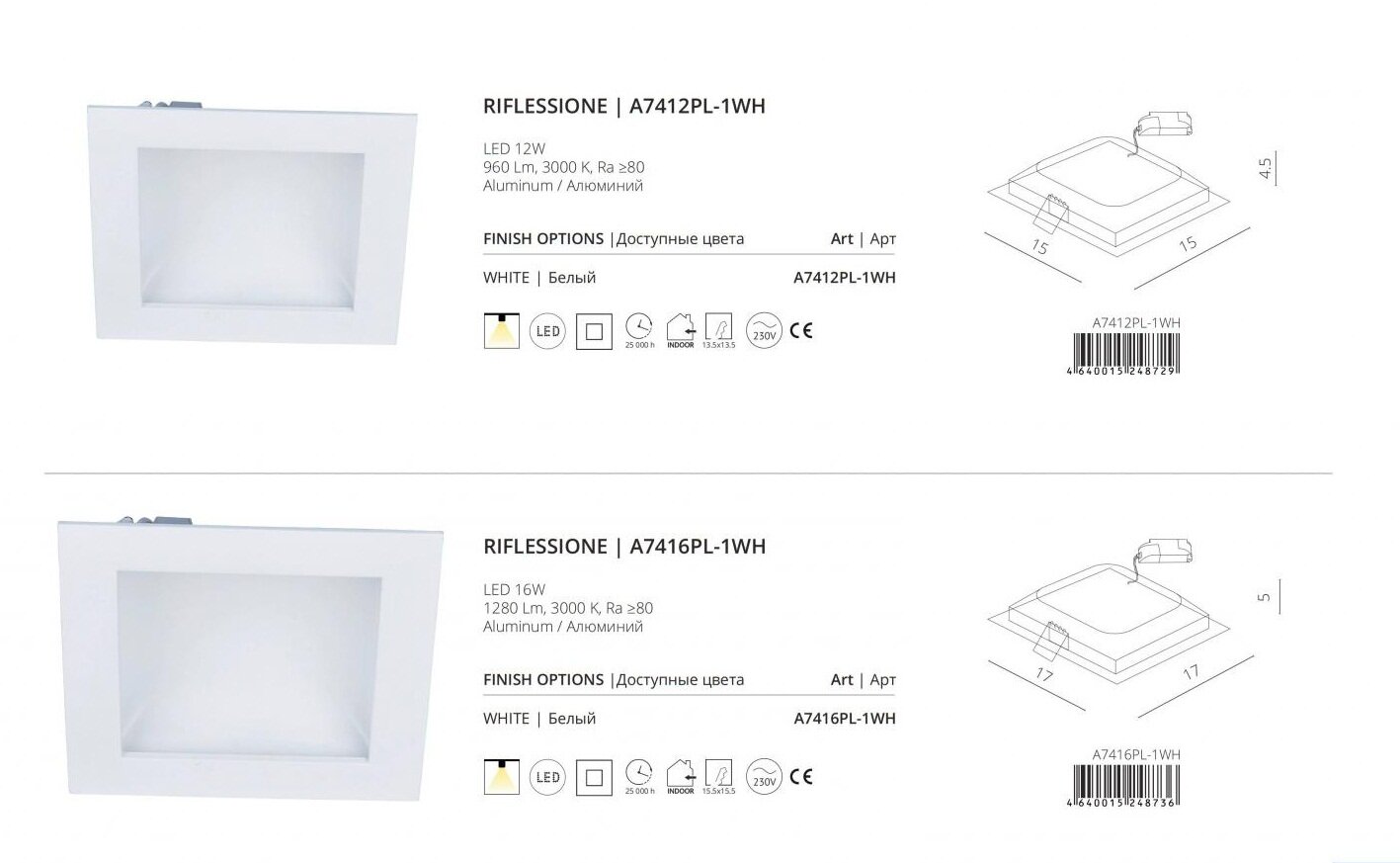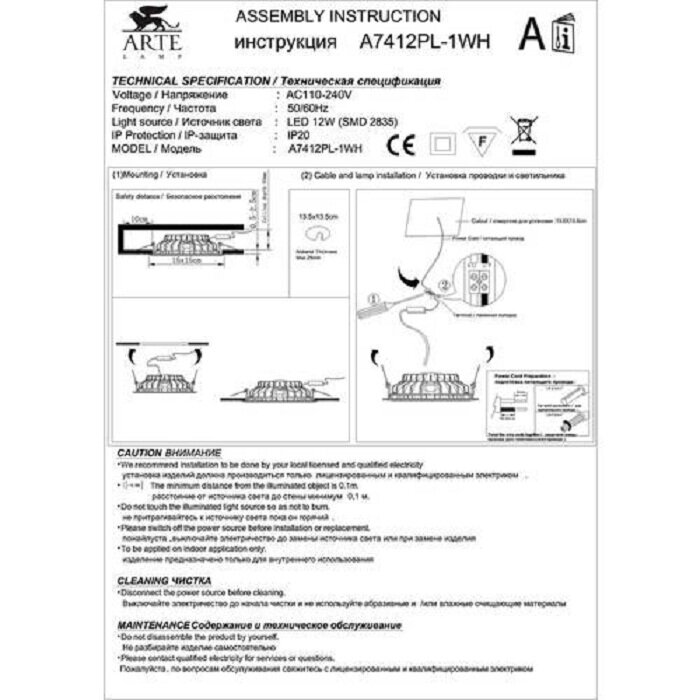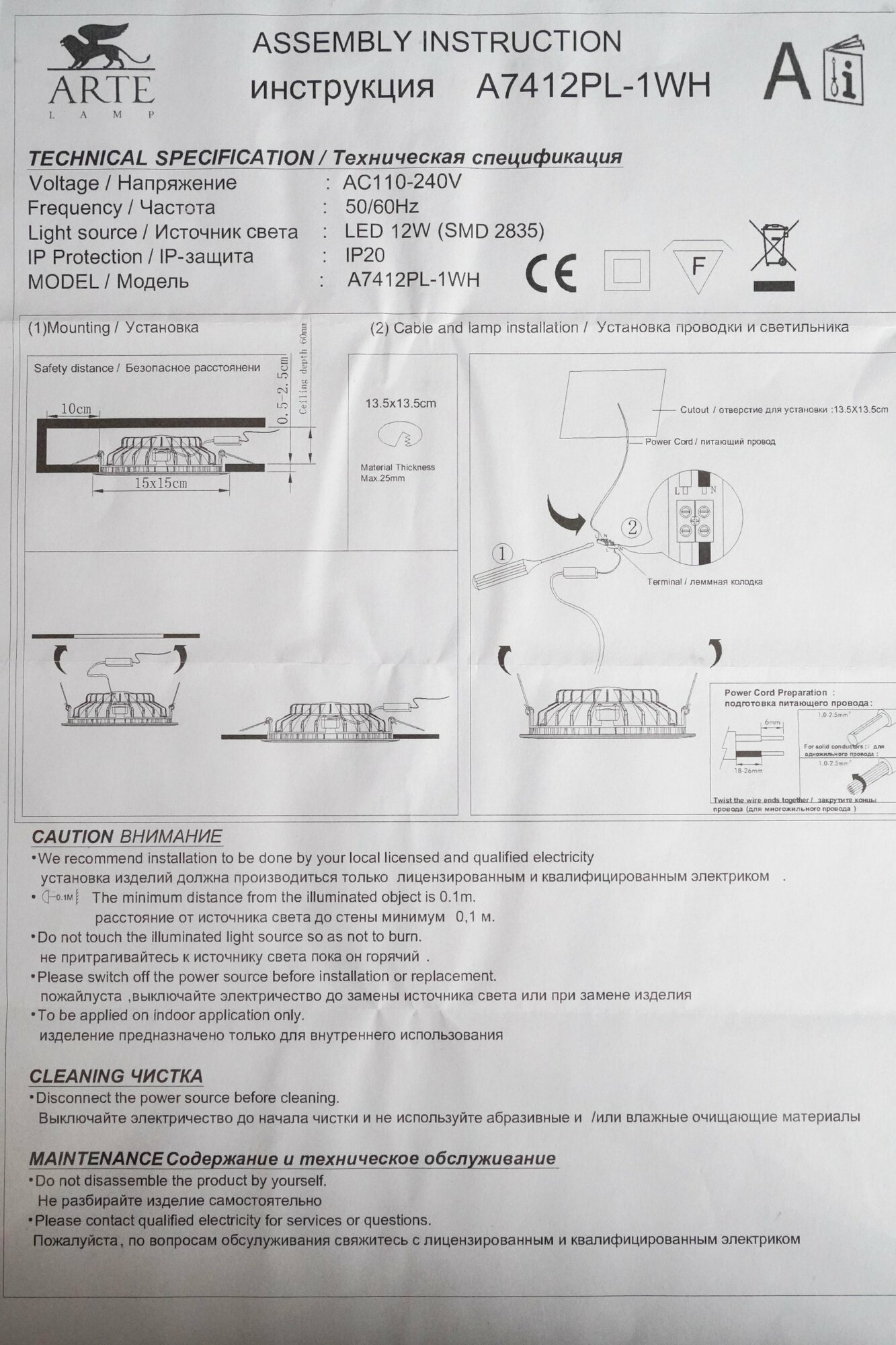 | Комплектация | Встраиваемые светильники Arte Lamp A7412PL-1WH |