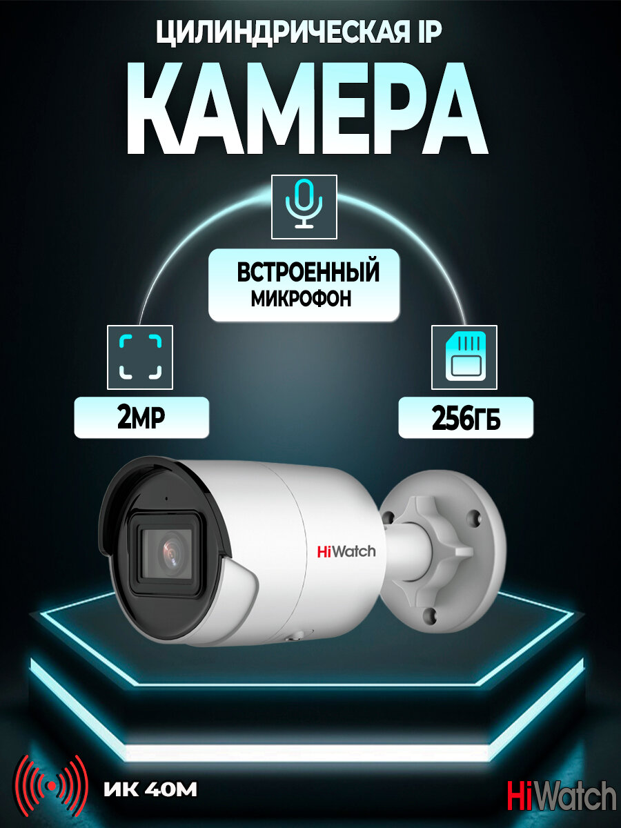 Видеокамера IP HiWatch IPC-B022-G2/U 2Мп с EXIR-подсветкой до 40м 1/2.8" Progressive Scan CMOS, 2.8мм, 107°, механический ИК-фильтр, 0.005лк F1.6, H.2
