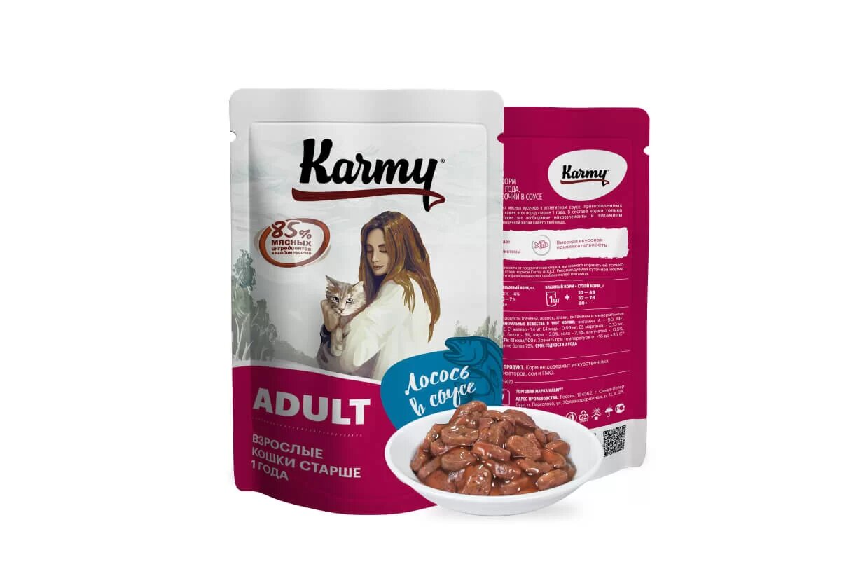 Консервы для кошек Karmy ADULT для кошек старше 1 года Лосось в соусе, паучи (80 г x 24 шт)