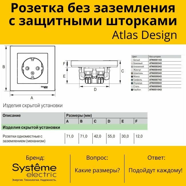 Розетка ATLASDESIGN, скрытый монтаж, со шторками, белый. ATN000149 Schneider Electric (3шт.)