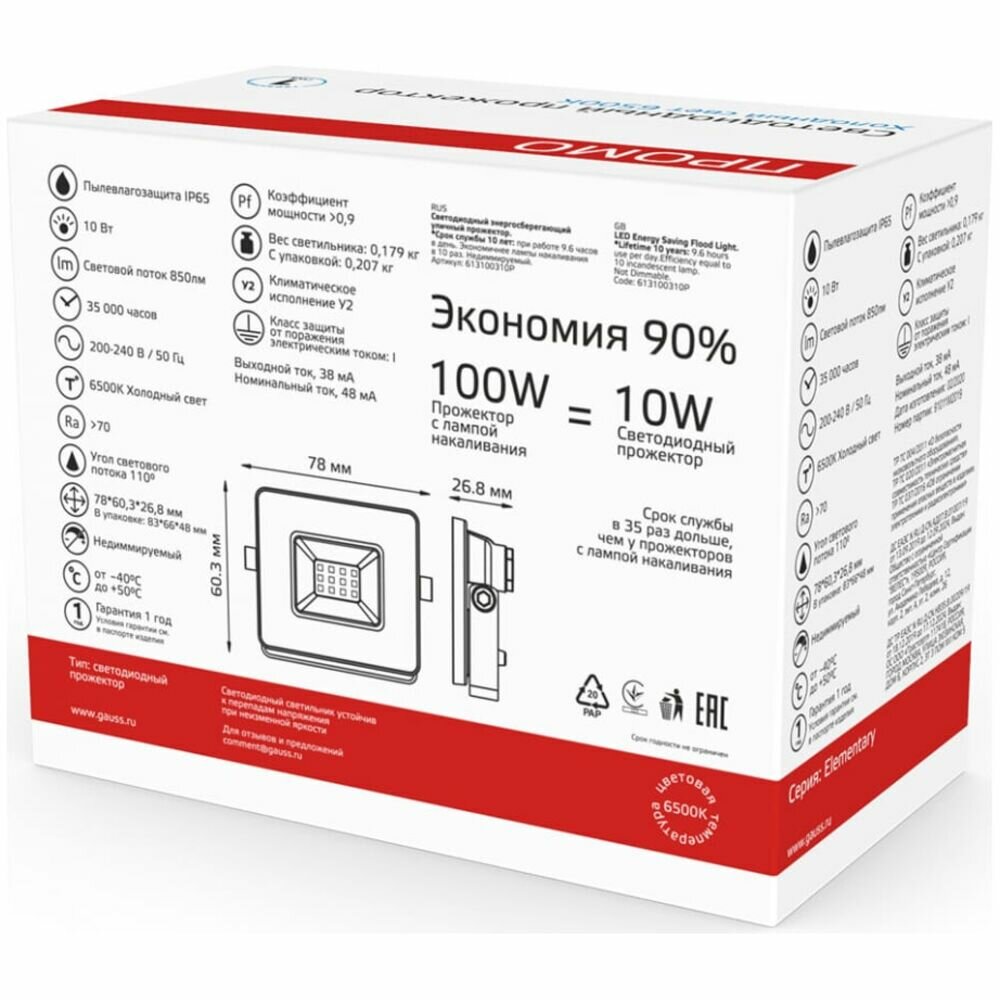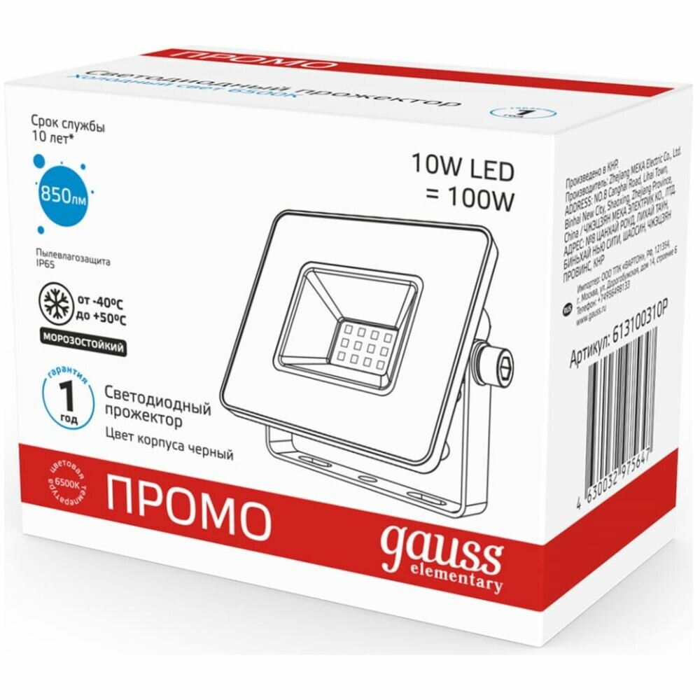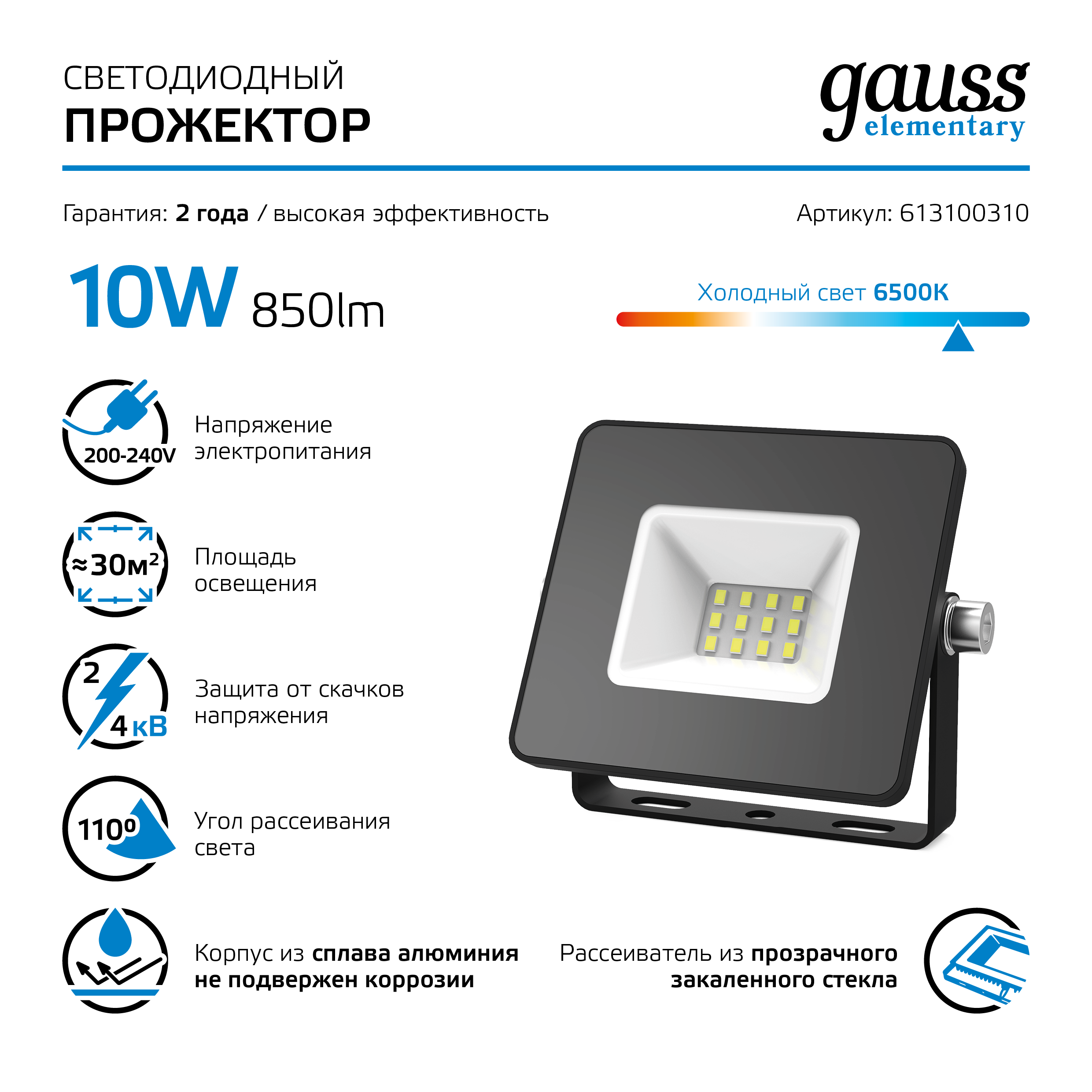 Прожектор Gauss Elementary 10W 6500К 850Лм светодиодный IP65 черный интересное: