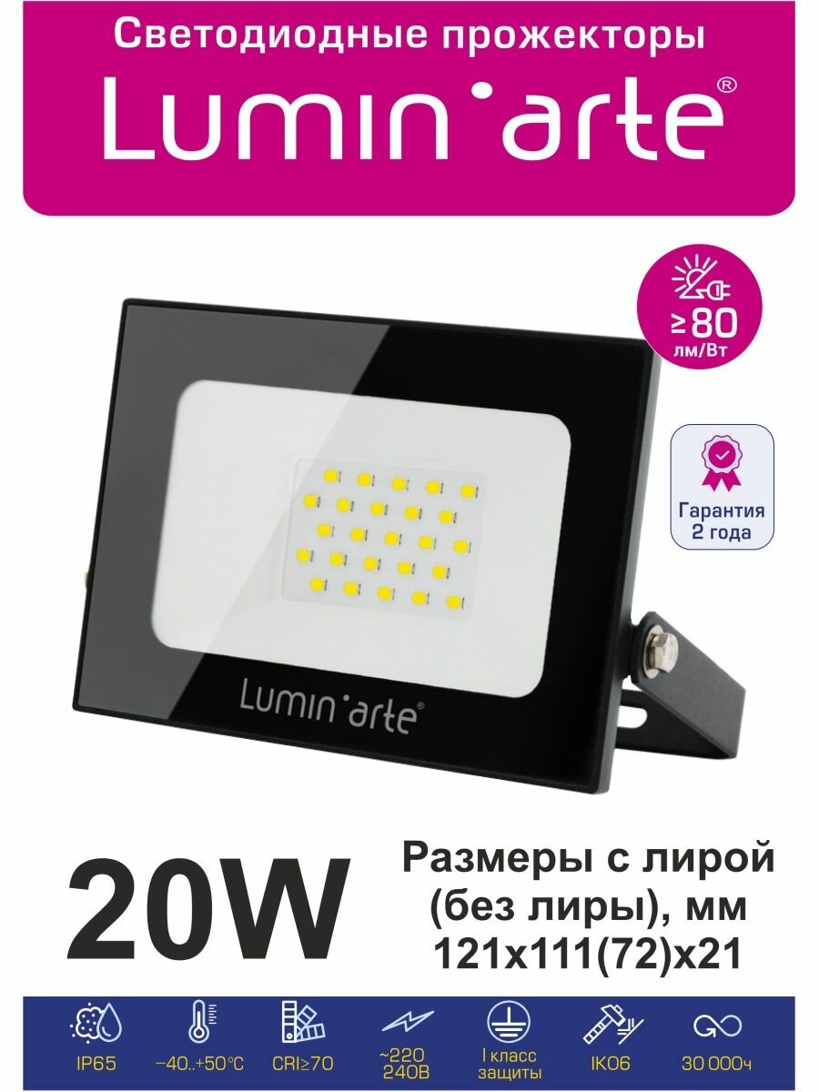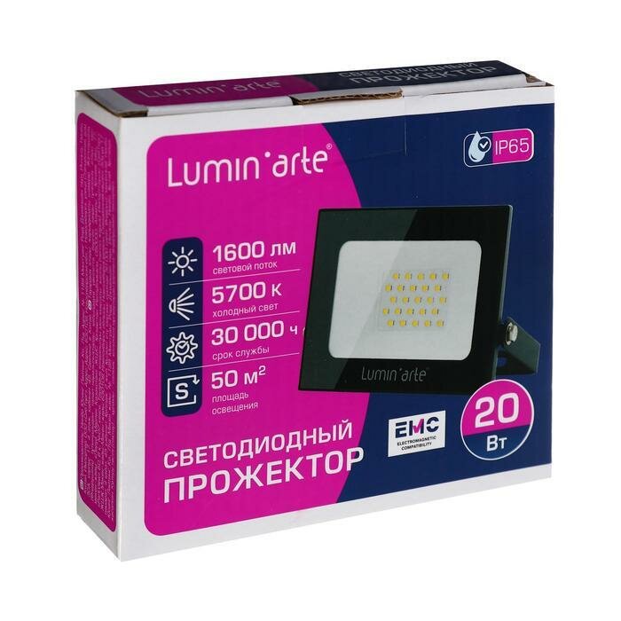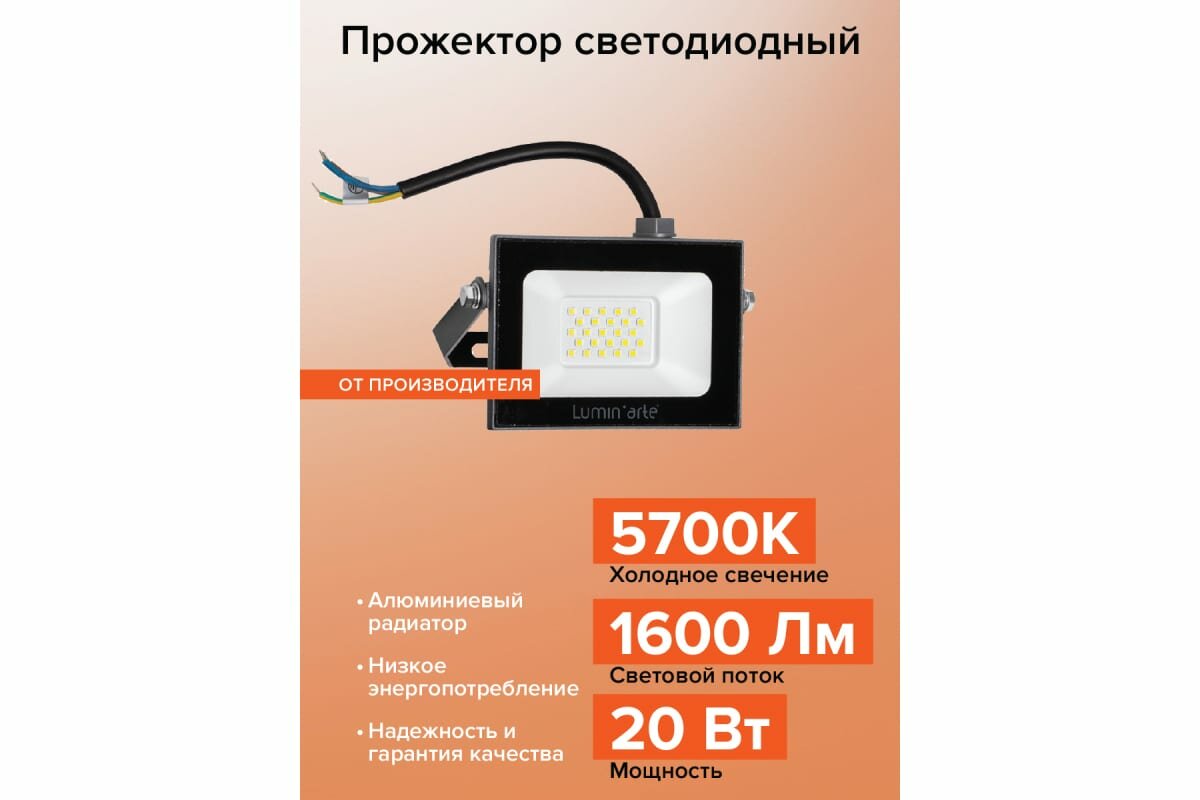 Lumin'arte Светодиодный прожектор LED 20Вт , 5700K Холодный белый свет , 800 лм черный , IP65 , LFL-20W/05
