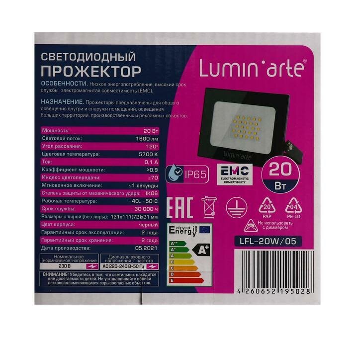 Lumin',arte светодиодн. прожектор 20W(1550lm) 5700K 6K IP65 102x15x90мм металл черный LFL-20W/05 (арт. 758094)