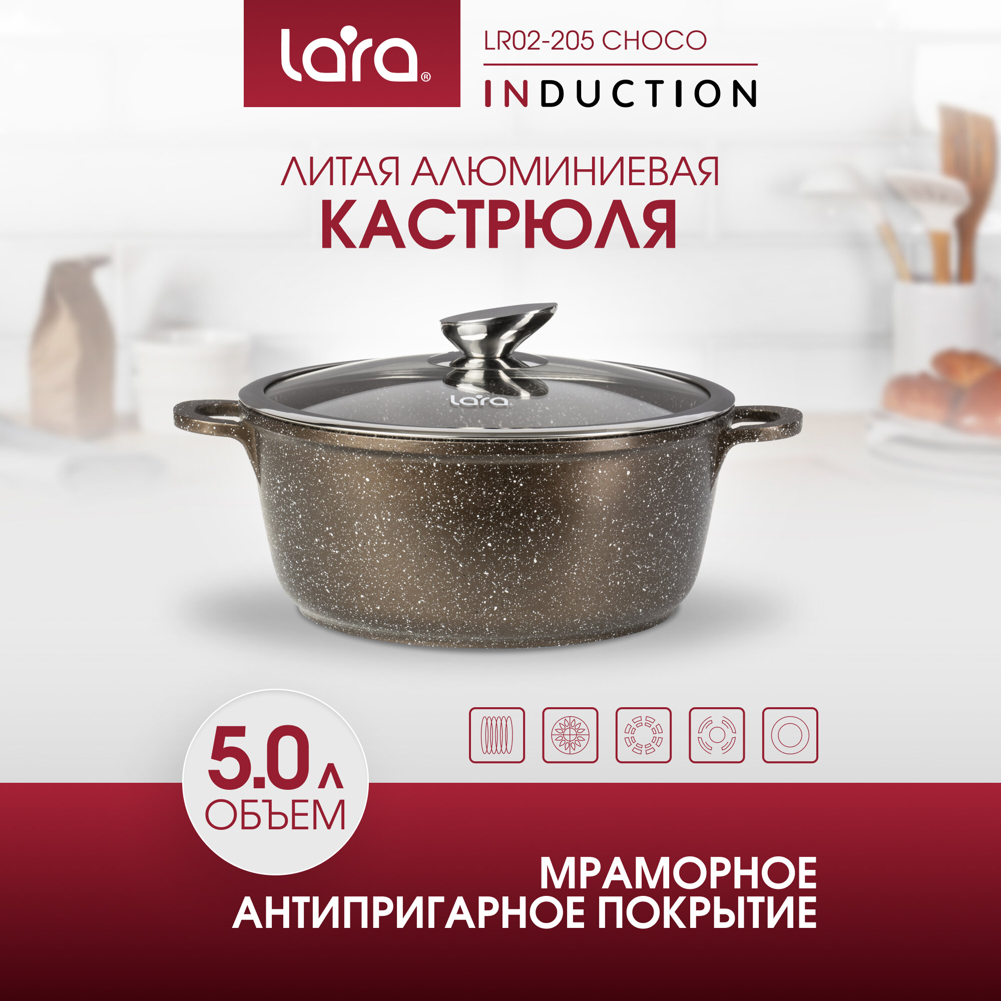 Купить LR02-205 Кастрюля LARA серия CHOCO 26х11,5см, 5.0л, мрамор, капсулированное, индукц. дно, крышка