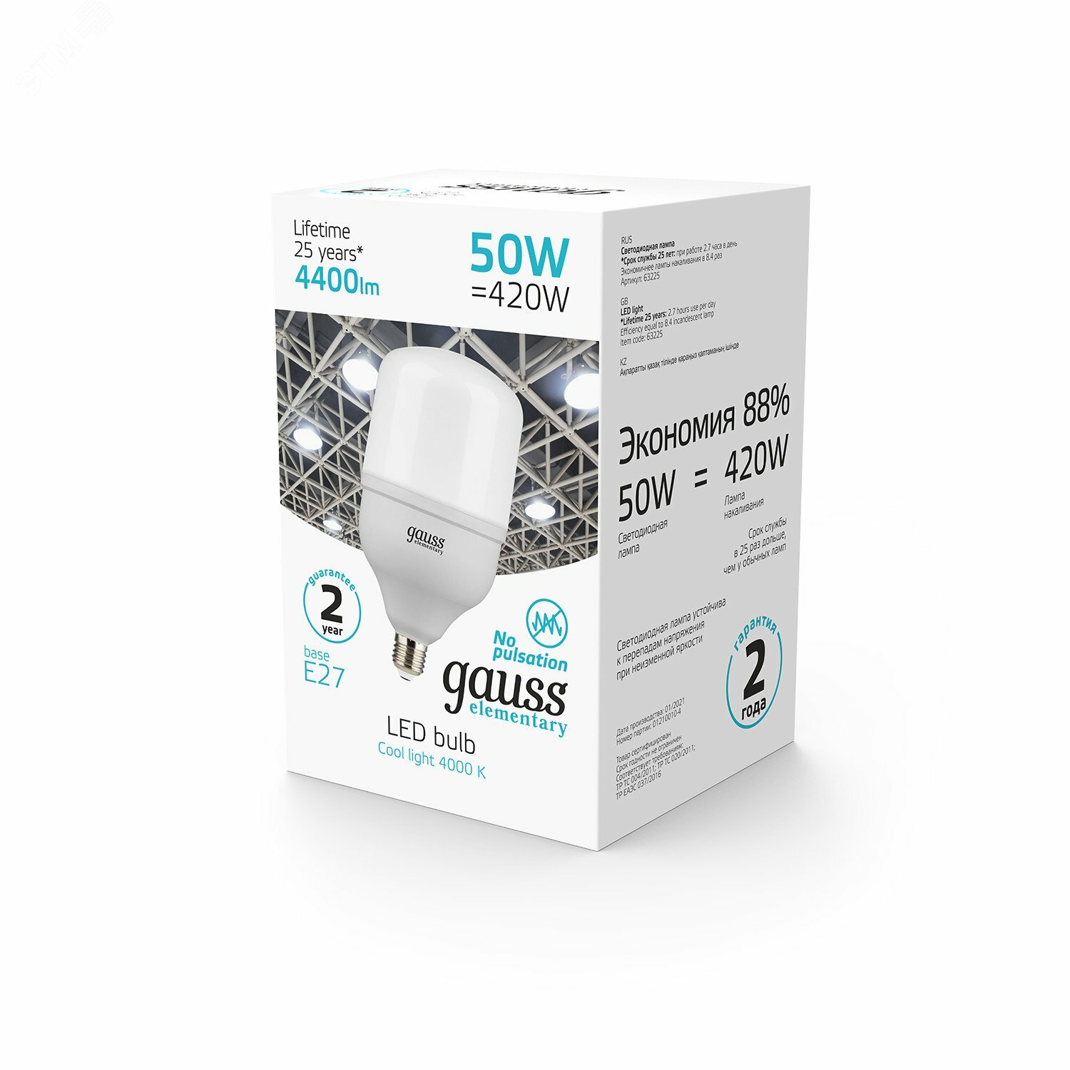 Лампа светодиодная LED 50 Вт 4400 Лм 4000К E27 цилиндр Т140 белая Elementary, GAUSS 63225 (1 шт.)