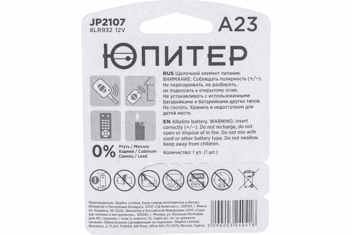 Батарейка А23 ЮПИТЕР 12 V, алкалиновая, 38 мА·ч, блистер, (JP2107)