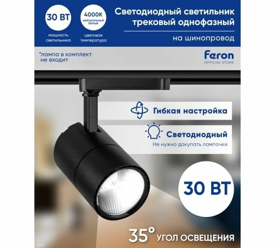 Светодиодный светильник AL103 трековый однофазный на шинопровод 30W 4000K, 35 градусов, черный, FERON 29649 (1 шт.)
