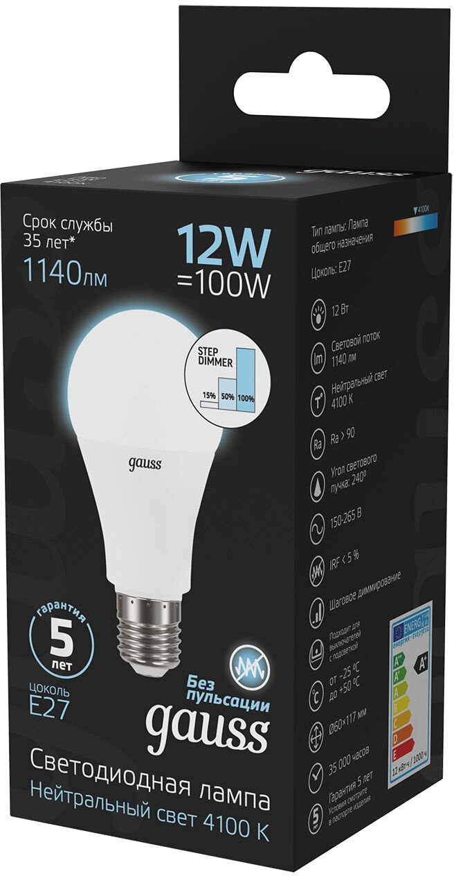 Лампа Gauss A60 12W 1140lm 4100K Е27 диммирование LED 1/10/50 102502212-S