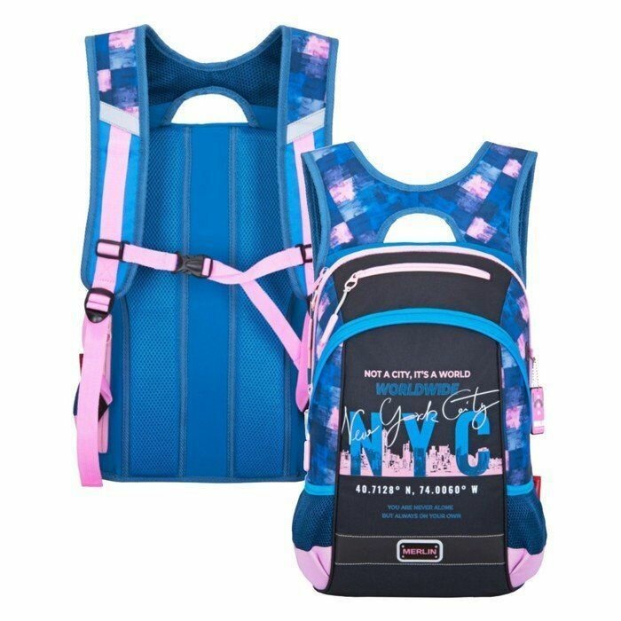 Рюкзак молодежный 43 х 29 х 15 см, эргономичная спинка, Merlin GL2020, NYC, чёрный/синий/розовый 21-GL2020-2