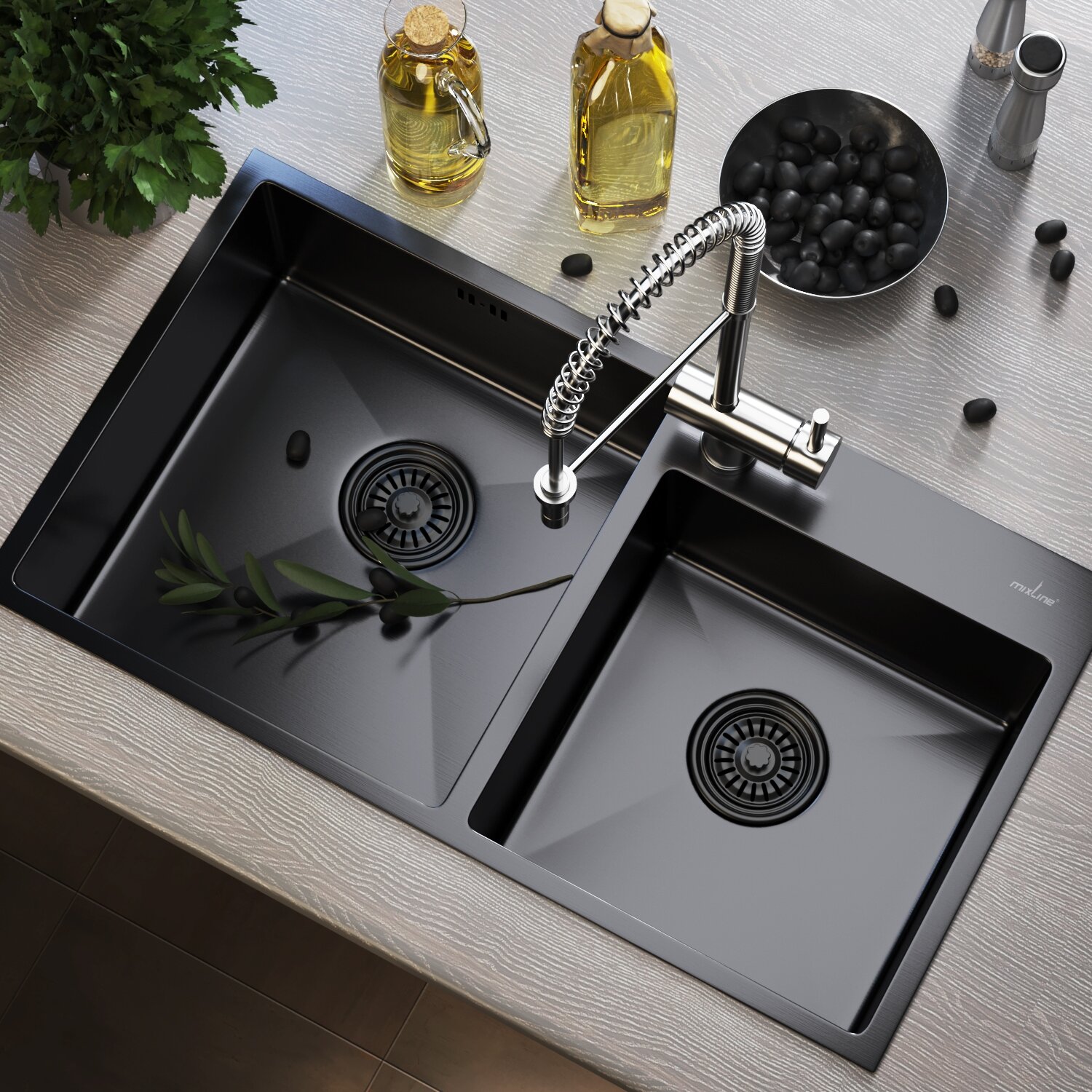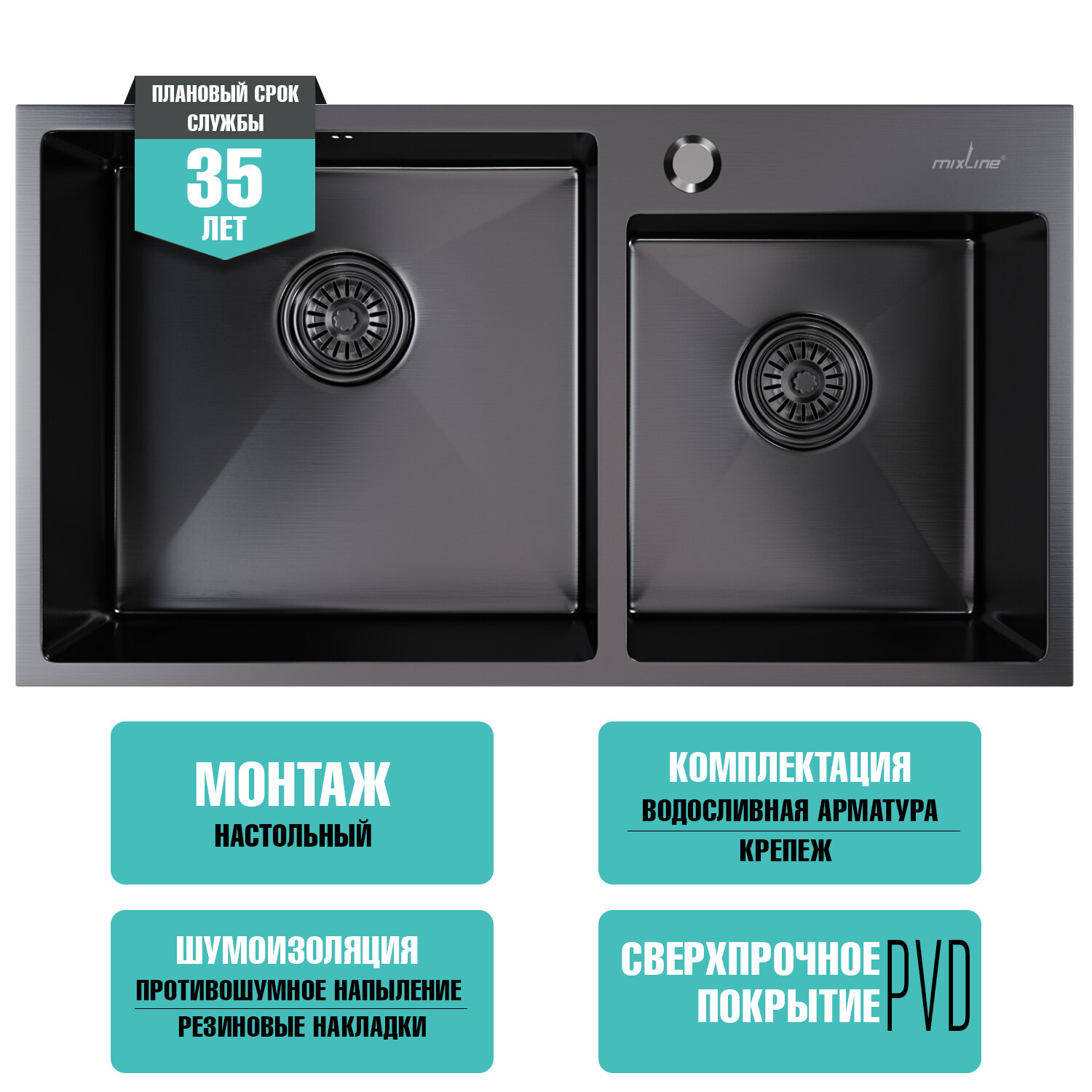 Раковина для кухни/ Мойка кухонная из нержавеющей стали Mixline Pro 72х40 с PVD покрытием, двухчашевая, с сифоном, темный графит