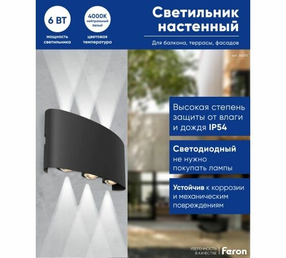 Feron Уличный настенный светильник DH101 06310 светодиодный, 6 Вт, цвет арматуры: черный, цвет плафона черный