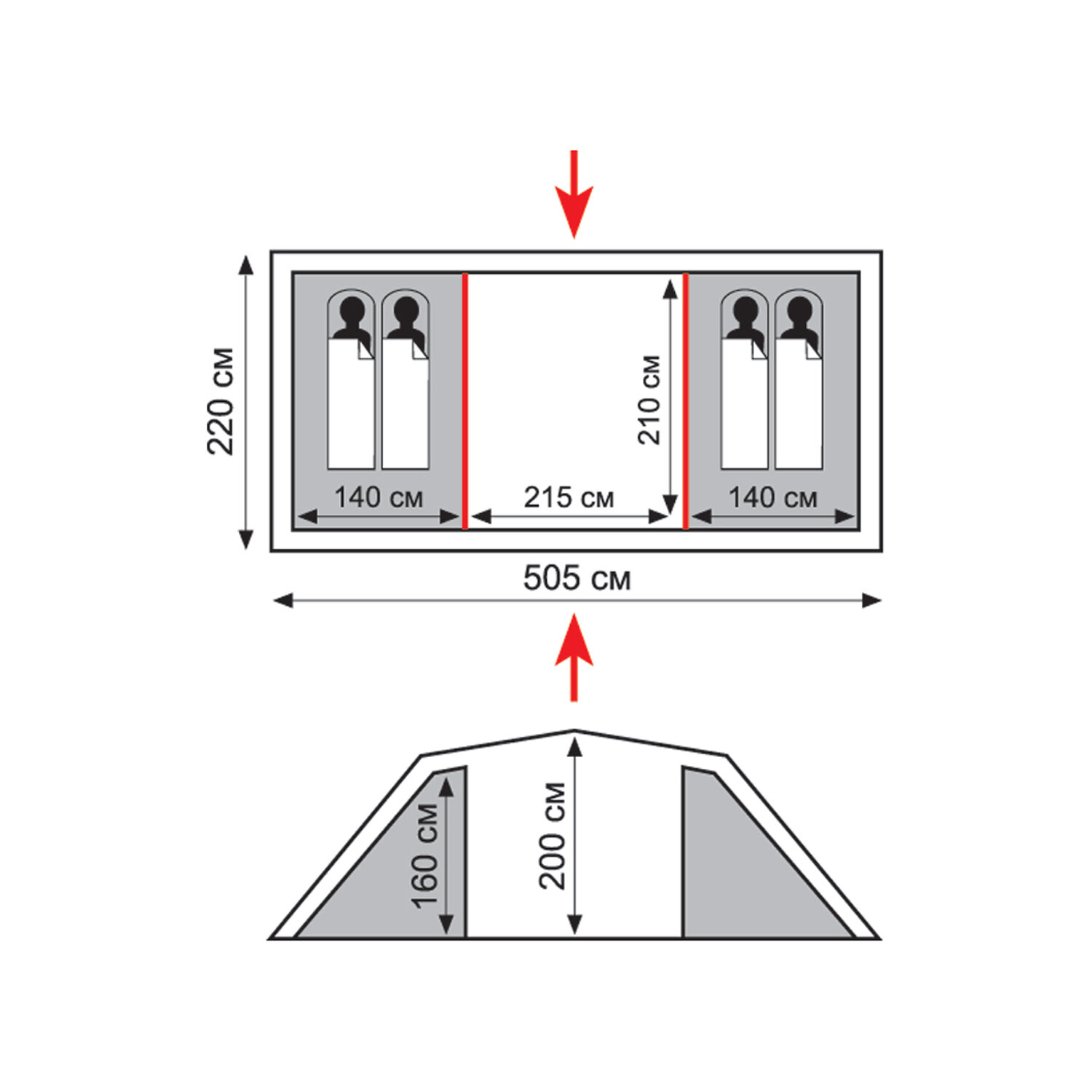 | Габариты внешней палатки(ДxШxВ) | 505x220x200 cм |