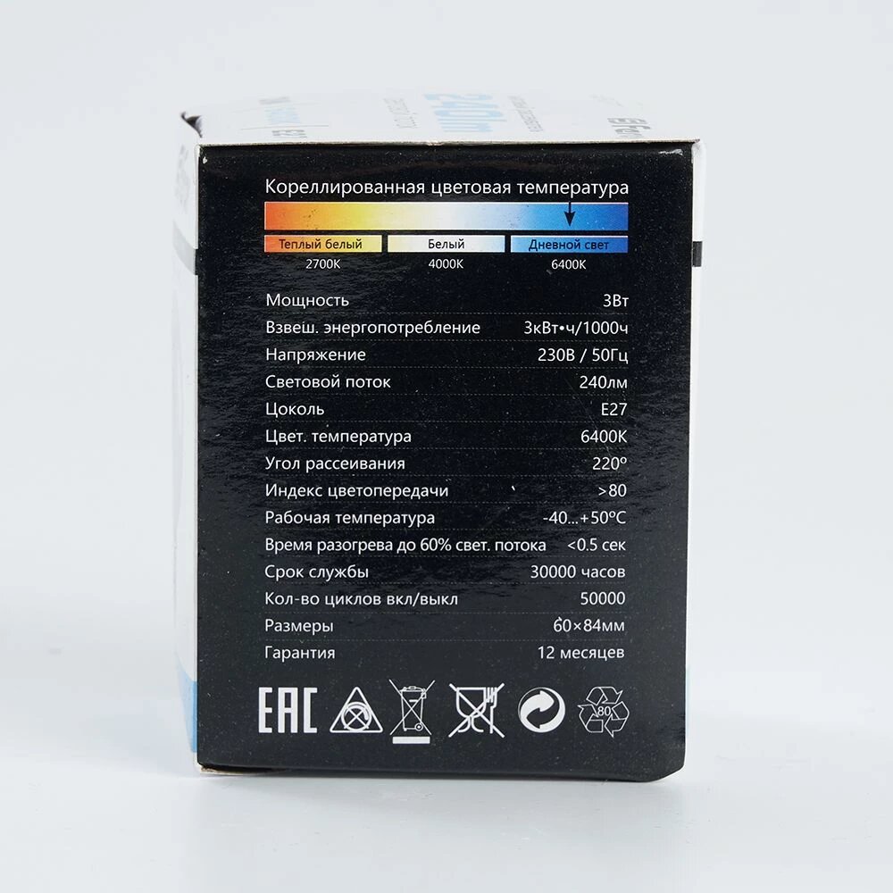 Лампочка светодиодная шар E27/G60 3Вт 240Лм белый холодный 6400К, 25902