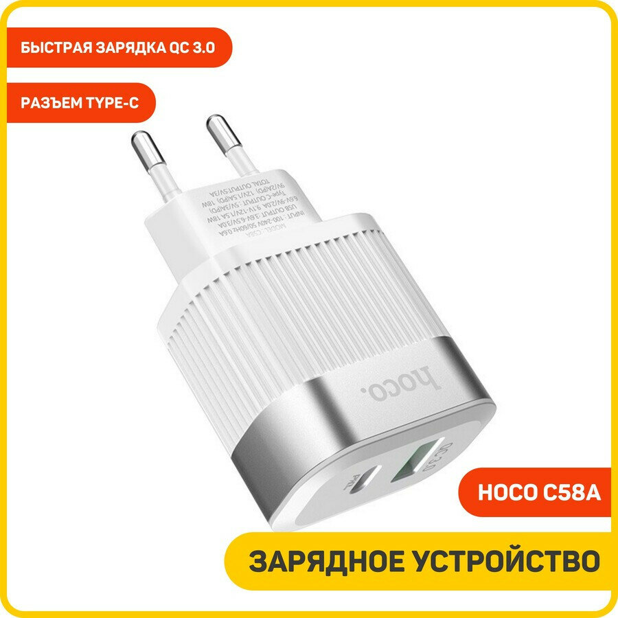 Сетевое зарядное устройство Hoco C58A 1USB+1Type-C/СЗУ/Зарядное устройство для телефона/Быстрая зарядка сетевая QC 3.0/Быстрая зарядка сетевая PD 20W/Адаптер питания/Переходник/Сетевой блок питания белый (41523)