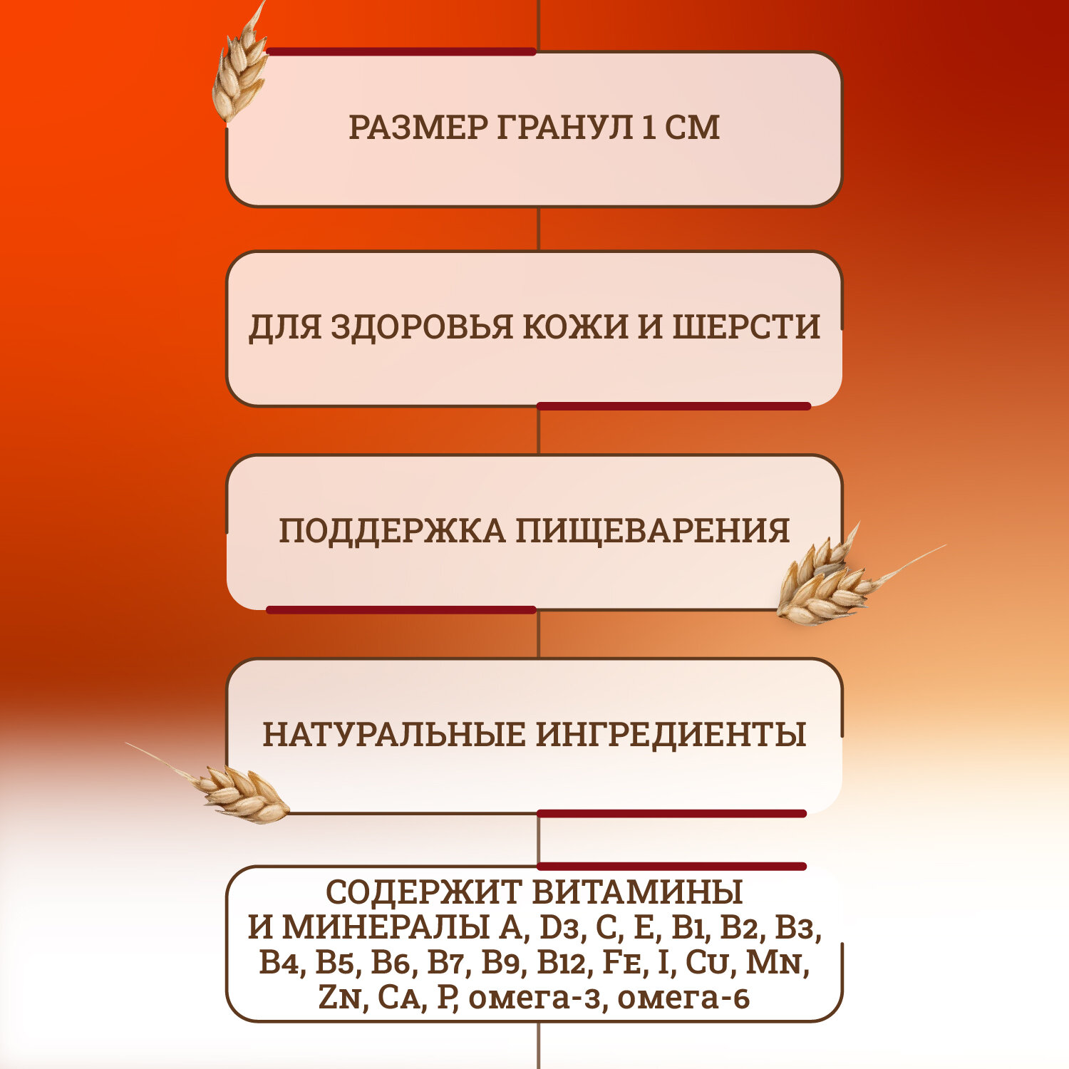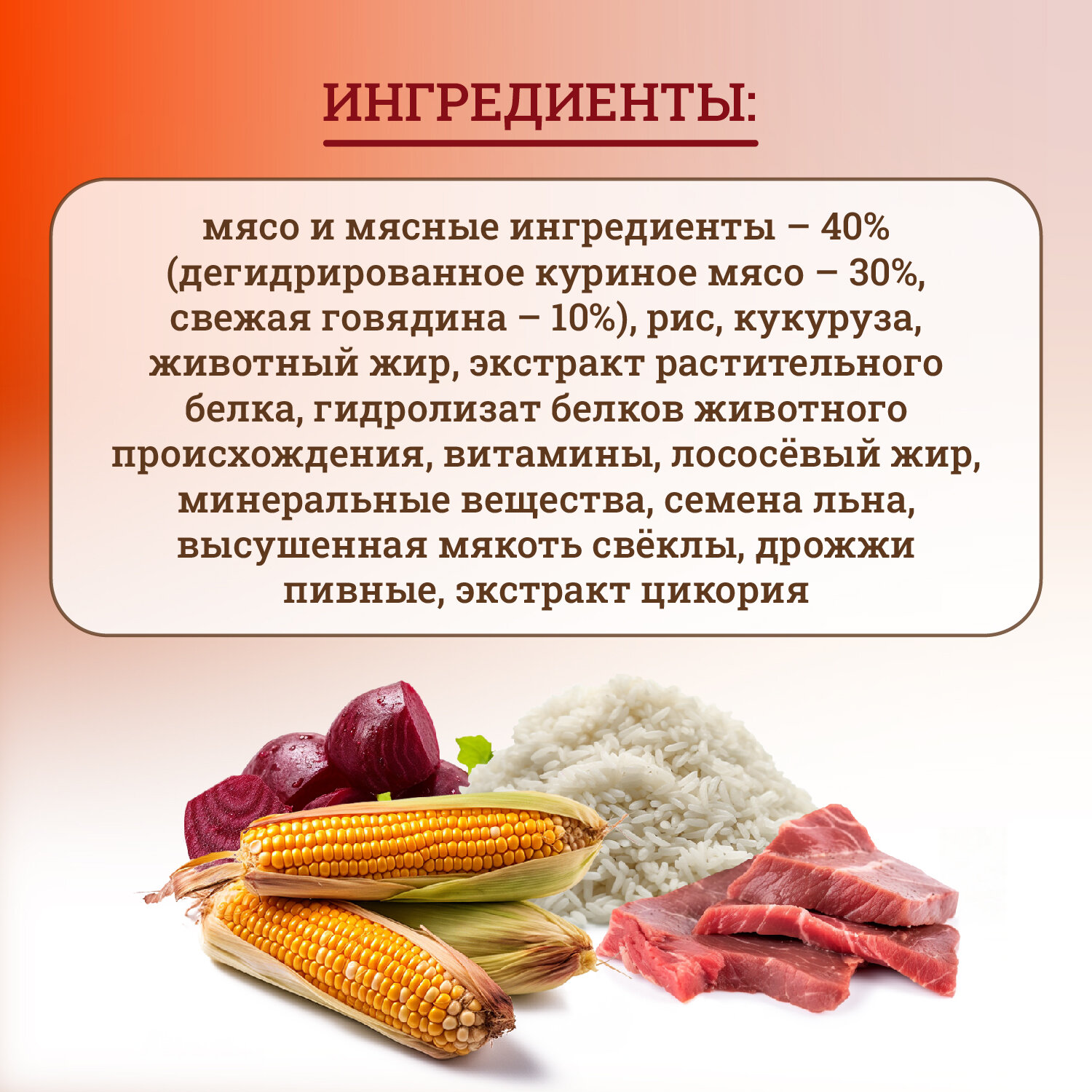 | Состав | мясо и мясные ингредиенты – 40% (дегидрированное куриное мясо – 30%, свежая говядина – 10%), рис, кукуруза, животный жир, экстракт растительного белка, гидролизат белков животного происхождения, витамины, лососёвый жир, минеральные вещества, семена льна, высушенная мякоть свёклы, дрожжи пивные, экстракт цикория. |
