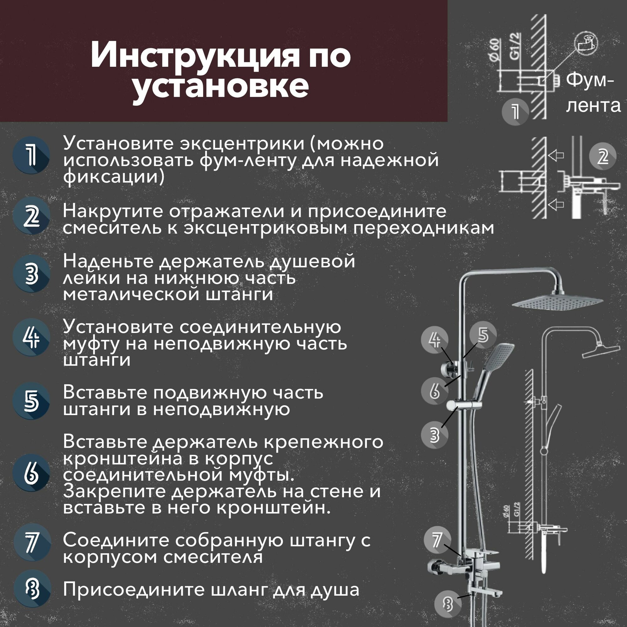 | Комплектация | Керамический картридж 35 мм / переключатель с керамическими пластинами / металлическая рукоятка / тропический душ 230/180 мм / душевой шланг 1,5 м. / 2 эксцентрика / держатель лейки с рег-ой по высоте / дешевая лейка (1 режим). |
