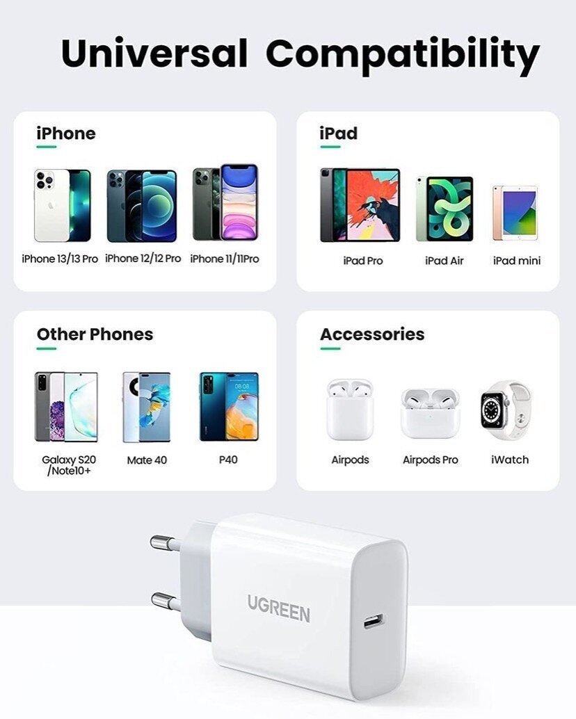 Сетевое зарядное устройство Ugreen с кабелем USB-C - Lightning PD Fast Charger 20 Вт, USB-C to Lightning Cable EU, белый (50698)