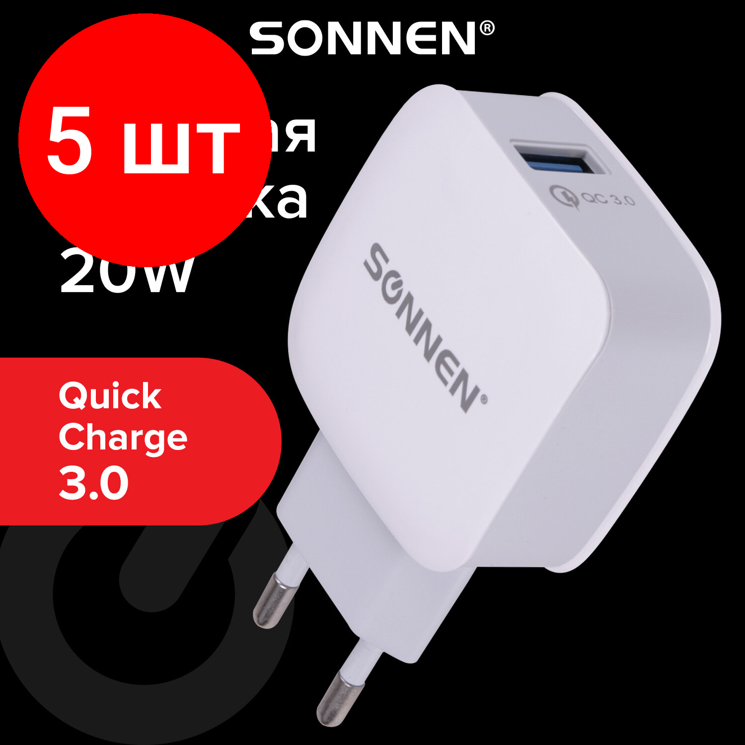 Купить Комплект 5 шт, Быстрое зарядное устройство сетевое (220В) SONNEN, порт USB, QC3.0,выходной ток 3А, белое, 455506