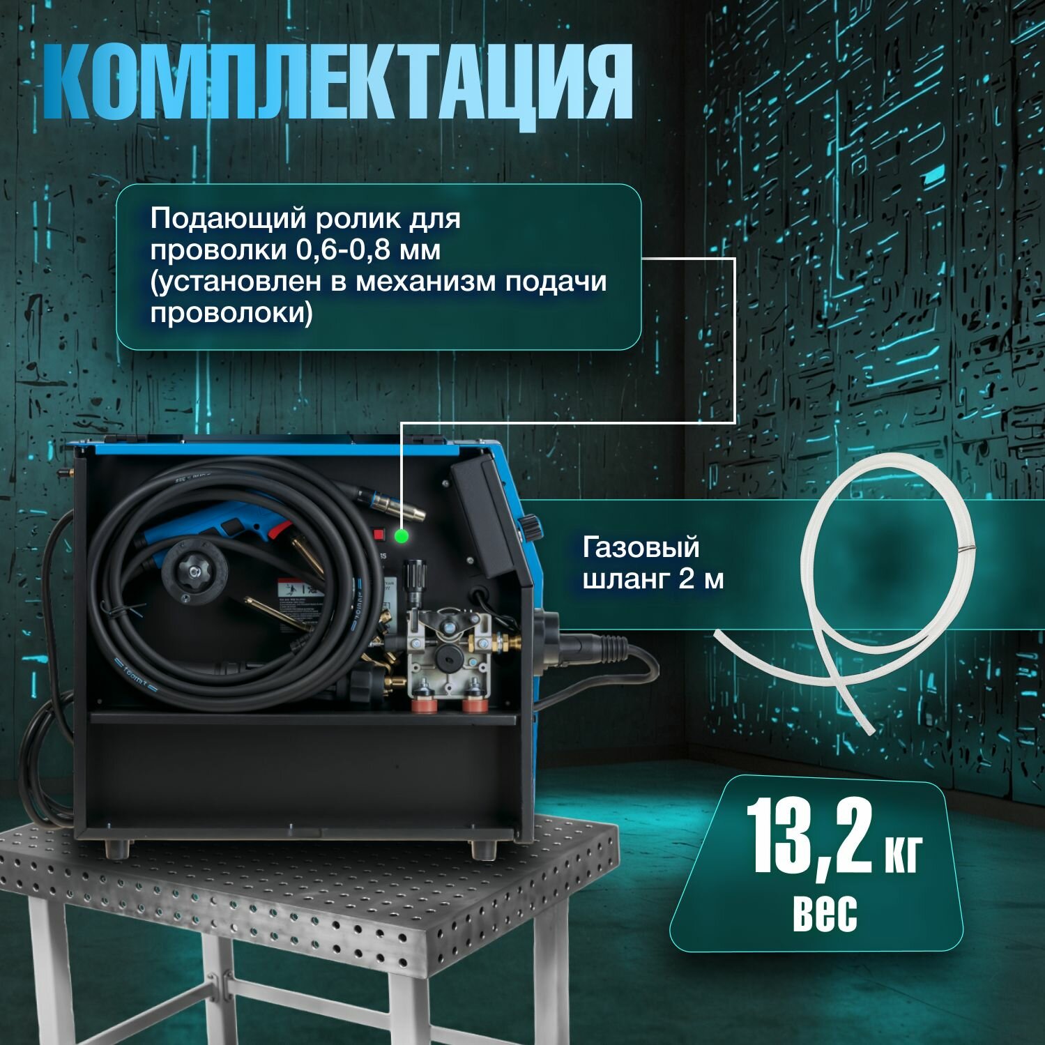 | Комплектация | инверторный полуавтомат; горелка сварочная 5 метров (поставляется в отдельной коробке); клемма заземления с кабелем 2 метра; газовый шланг 2 метра; подающий ролик для проволоки |