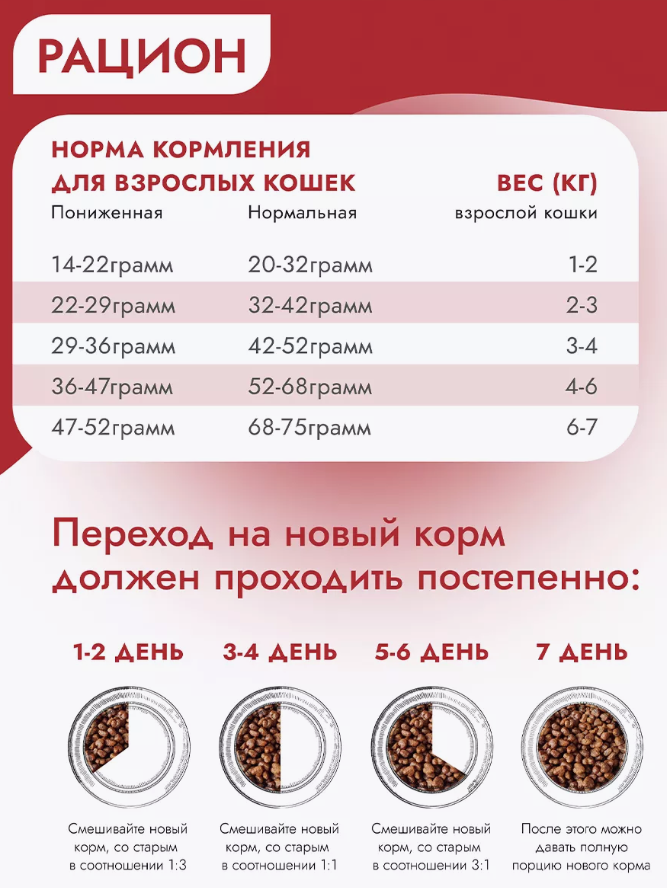 | Дозировка | Норма потребления корма для кошек 30-50 г на кг веса животного в 2 приема кормления. Норма потребления корма для котят 40-60 г на кг веса животного в 2-3 приема кормления |