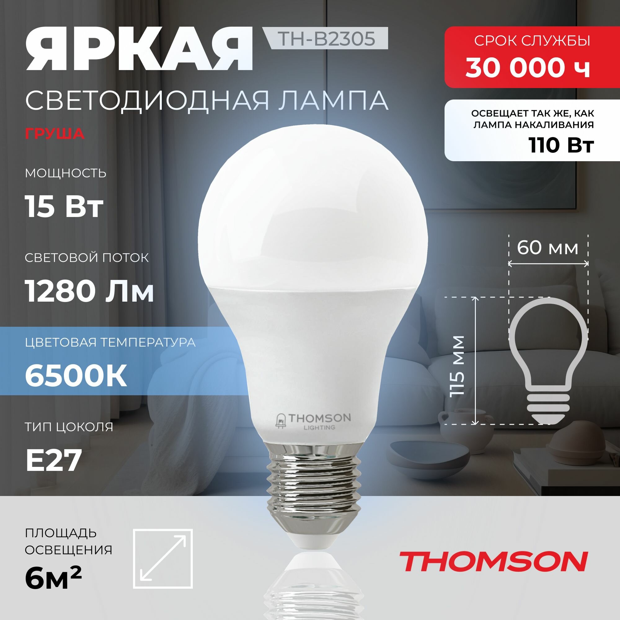 Лампочка Thomson TH-B2305 15 Вт, E27, 6500K, груша, холодный белый свет