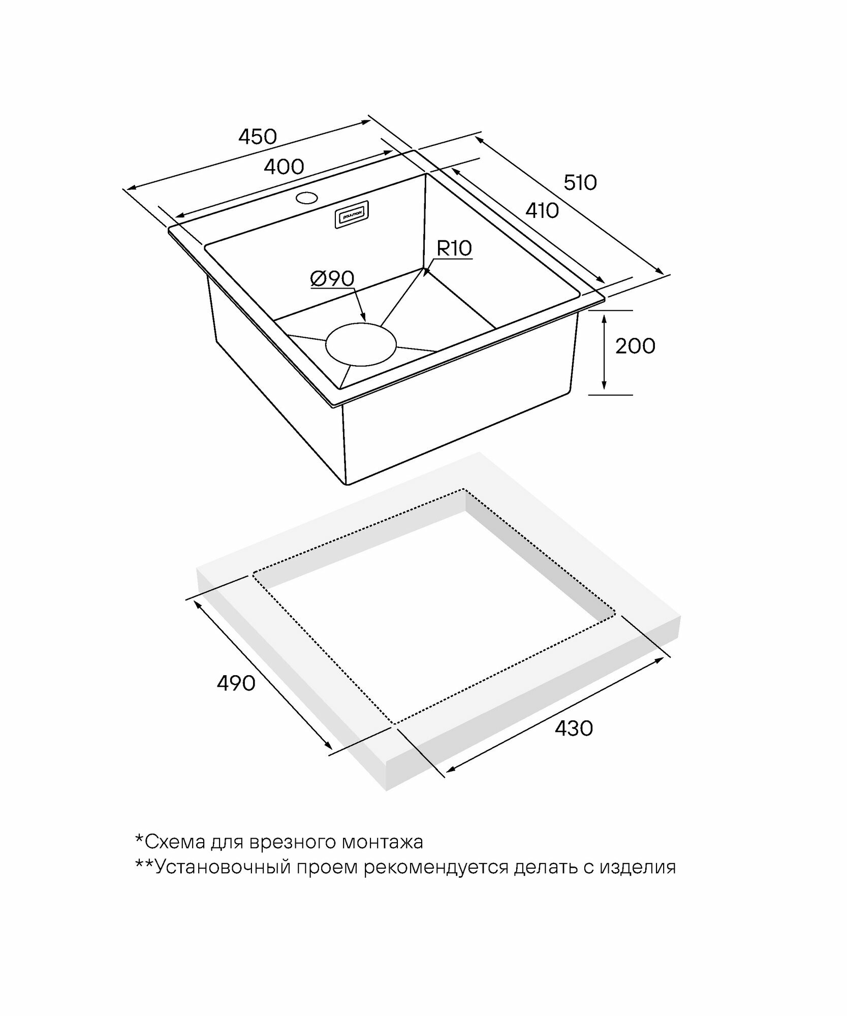 Мойка для кухни из нержавеющей стали AISI304 Paulmark VELTEN 45, 450х510 мм, PVD и шумопоглащающее покрытие, отверстие под смеситель, универсальный монтаж, цвет нерж. сталь