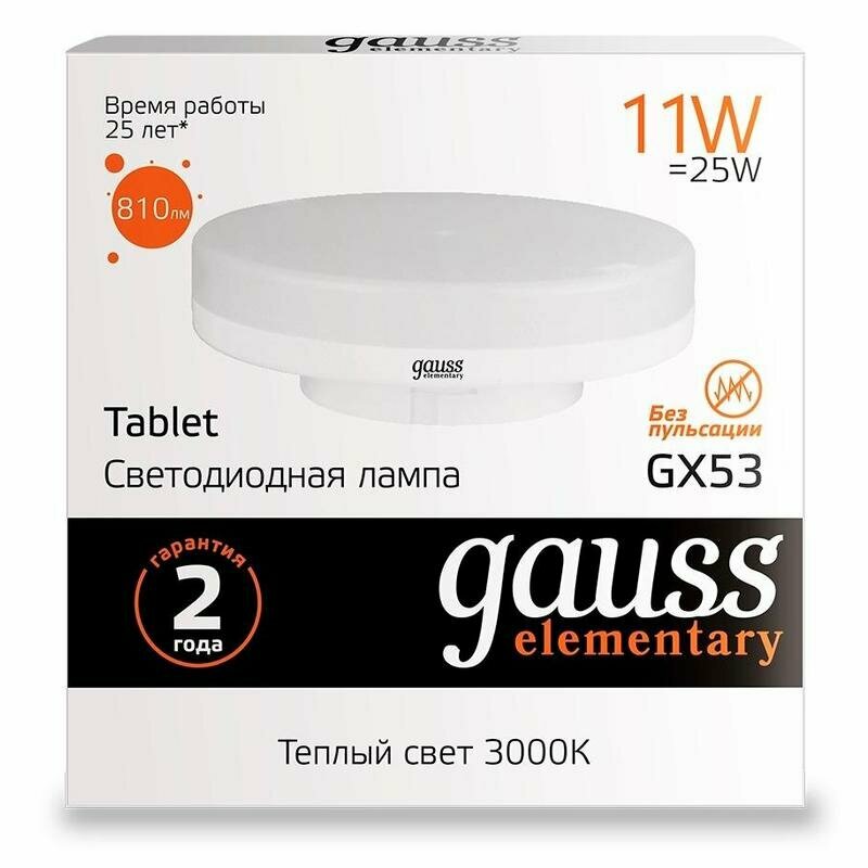 Лампа светодиодная Gauss Elementary GX53 11Вт цок.:GX53 таблетка 220B 3000K св.свеч.бел.теп. Tablet (упак.:1шт) (83811)