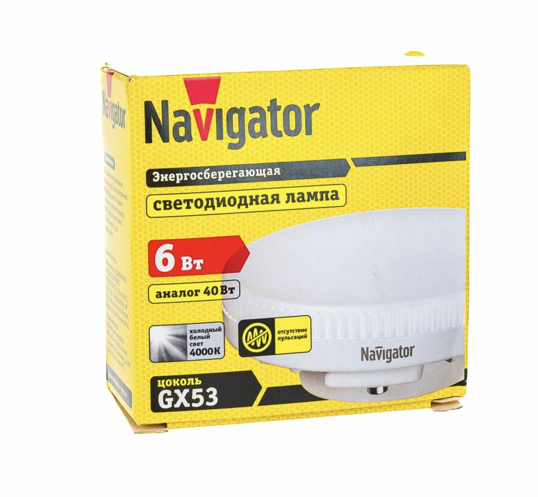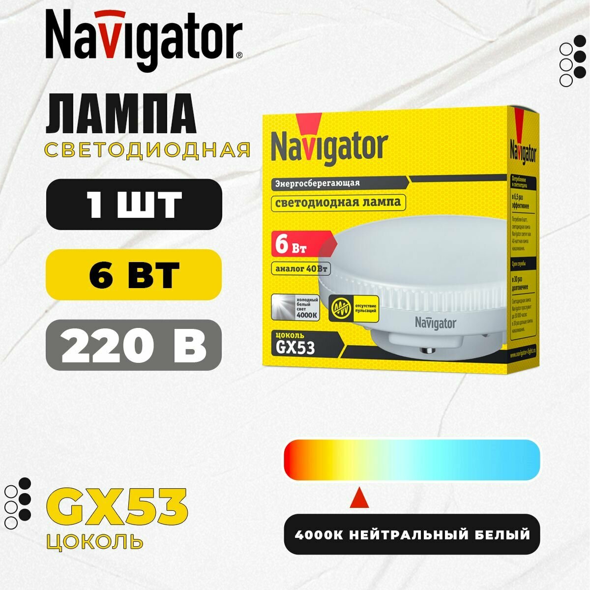 (25 шт.) Светодиодная лампочка Navigator, мощность 6 Вт, напряжение питания 220 В, цветовая температура 4000 К, нейтральный белый свет, цоколь GX53, таблетка, размер 74х28