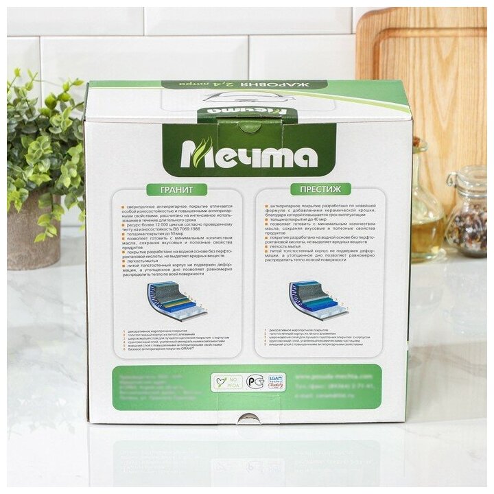 | Отзыв: | Обычно на гранитной посуде с антипригарным покрытием ничего не прогорает. Поэтому предпочитаем покупать посуду этой линии. Купили жаровню на 2,4 л. Толщина дна 6 мм. Крышка 24, дно - 18. Ручка крышки нержавейка. При готовке немного нагревается. Производство г. Кукмор, Татарстан. Раньше пользовались "Kukmara". Формы, цвет и качество практически не отличаются. В общем я так поняла, что "Мечта" и "Kukmara" родные сестры (если кто знает и пользуется "Kukmara"). |