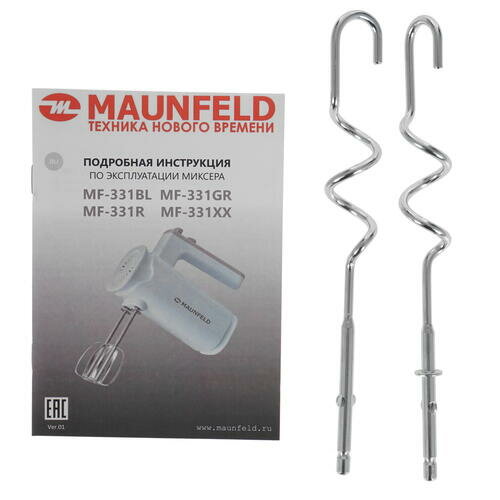 Миксер Maunfeld Mf-331bl, ручной, 300 Вт, 8 скоростей, 4 насадки, голубой Maunfeld 9365394 .