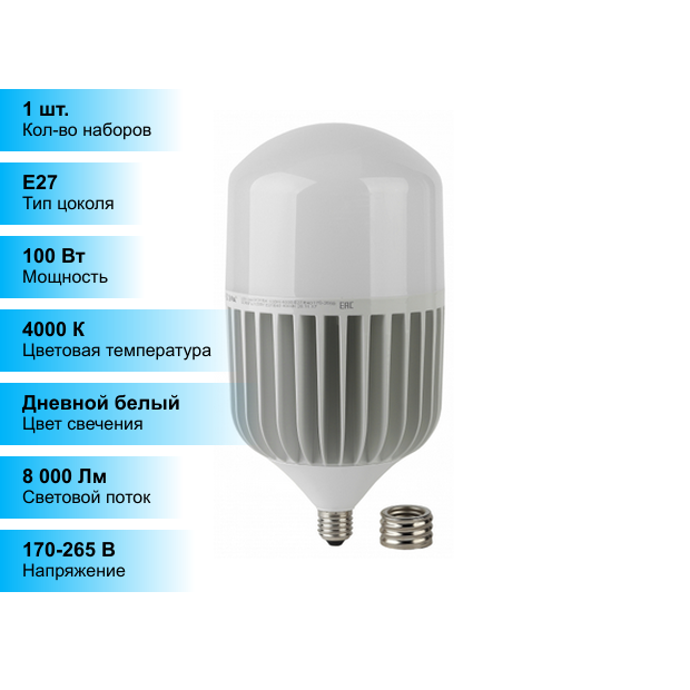 Лампа светодиодная высокомощная STD LED POWER T160-100W-4000-E27/E40 100Вт T160 колокол 4000К нейтр. бел. E27/E40 (переходник в компл.) 8000лм Эра Б0032089