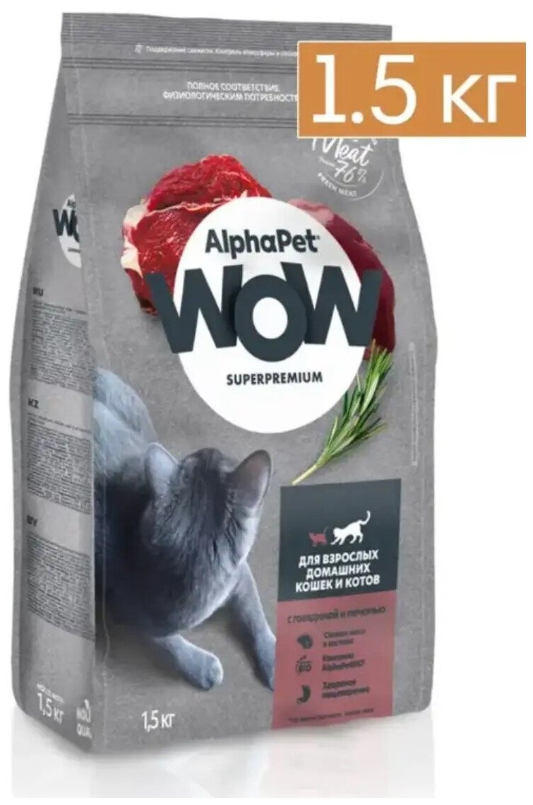 Корм сухой Alphapet WOW Superpremium с говядиной и печенью для взрослых домашних кошек и котов, 1,5 кг
