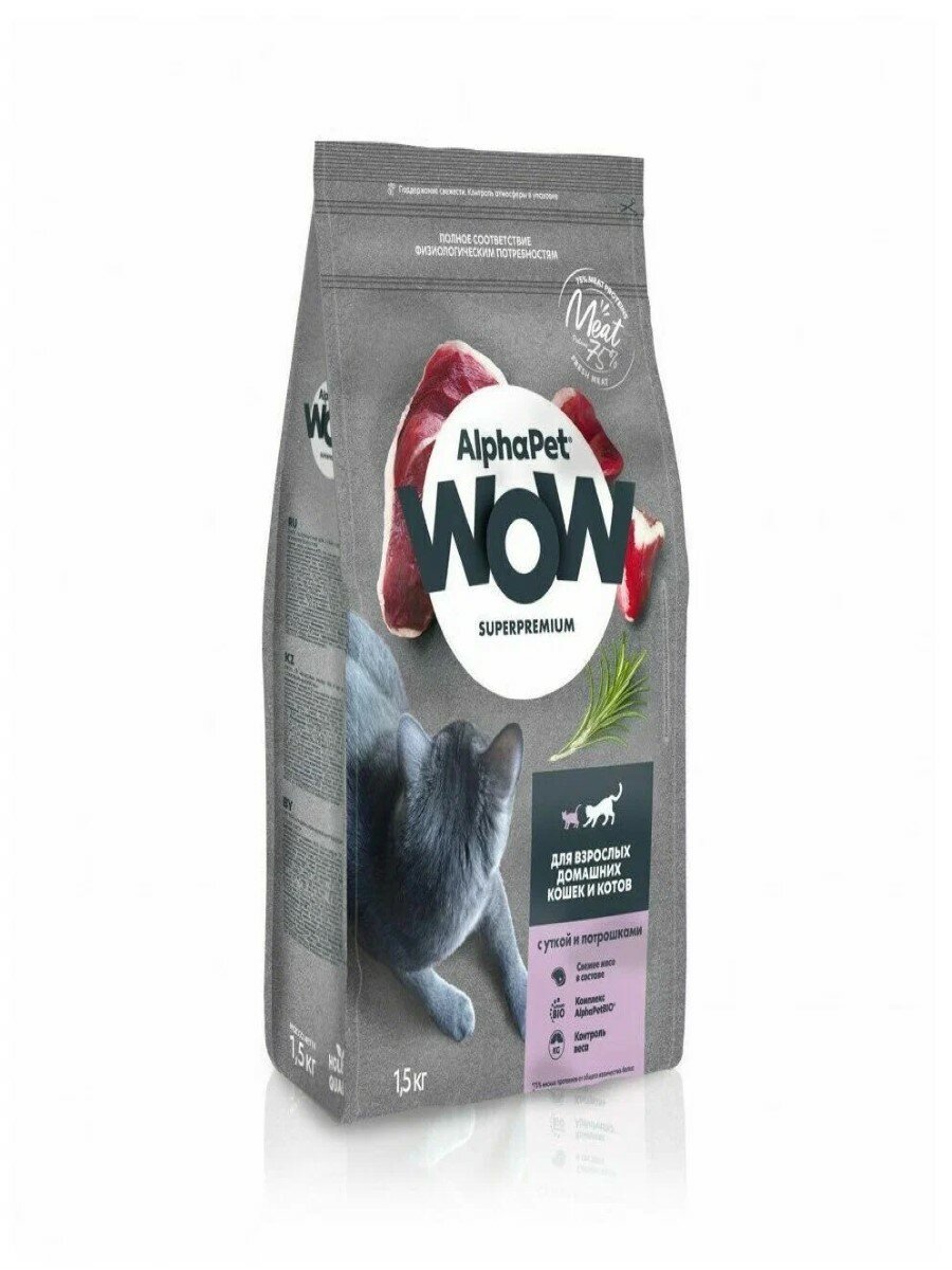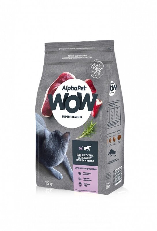 Сухой корм Alphapet Superpremium Wow для взрослых домашних кошек с уткой и потрошками, 1,5 кг