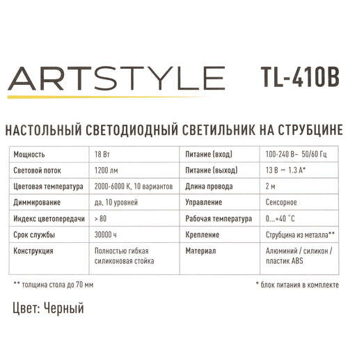 Светильник настольный ARTSTYLE TL-410B светодиодный, диммируемый, изменение цветовой температуры, на струбцине