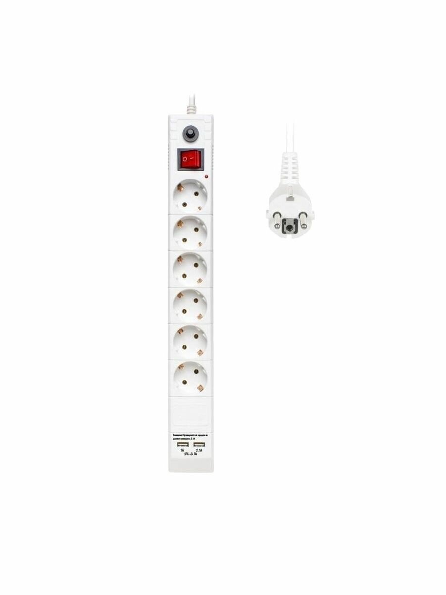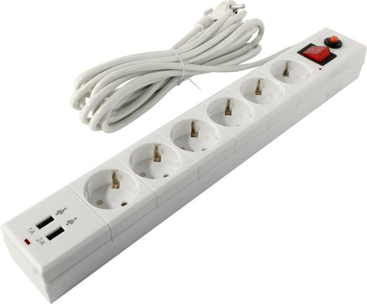 Сетевой фильтр Buro BU-SP5_USB_2A-W, 6 розеток, 5 м, с/з, 10А / 2200 Вт белый