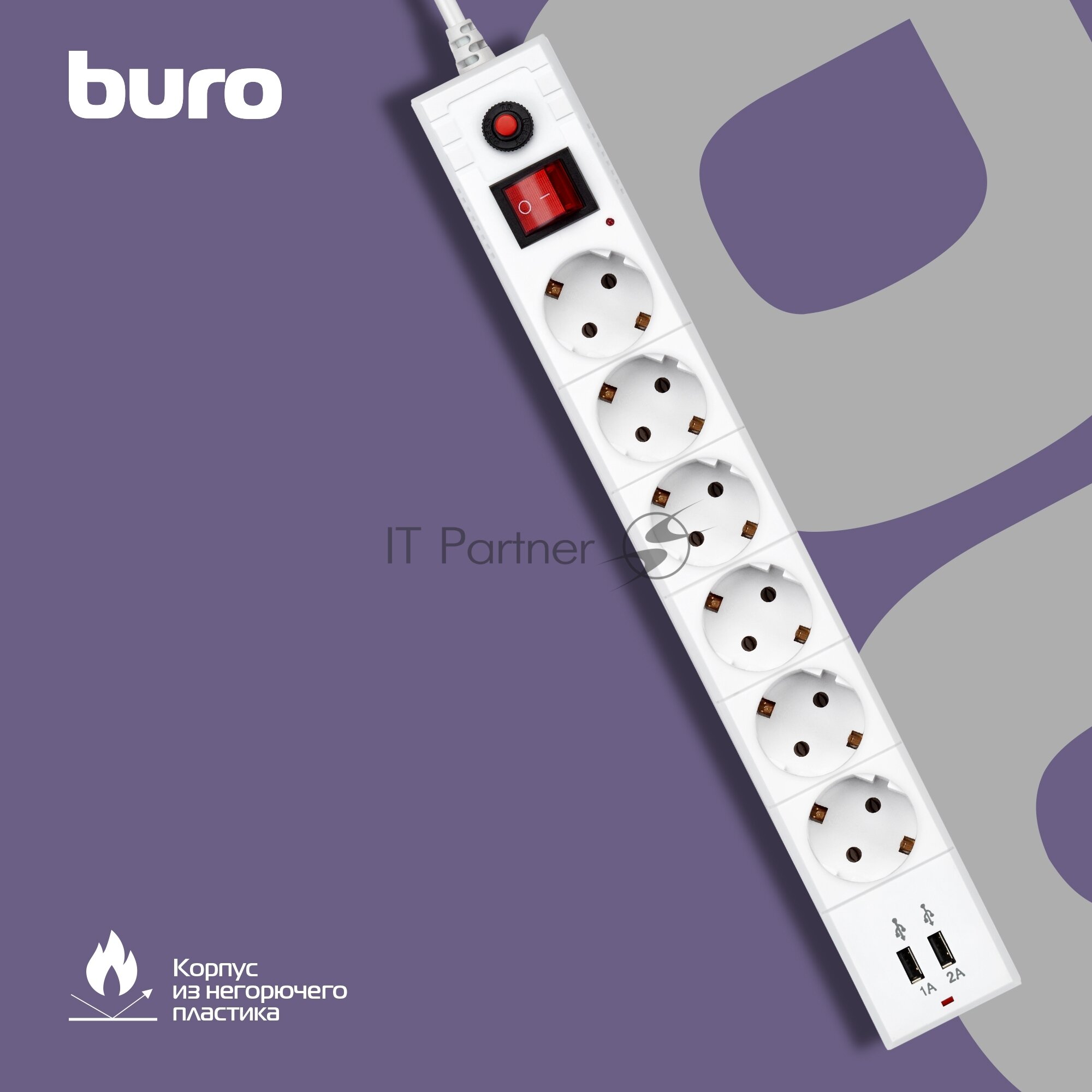 Сетевой фильтр BURO BU-SP5_USB_2A-W 6м White 6 розеток
