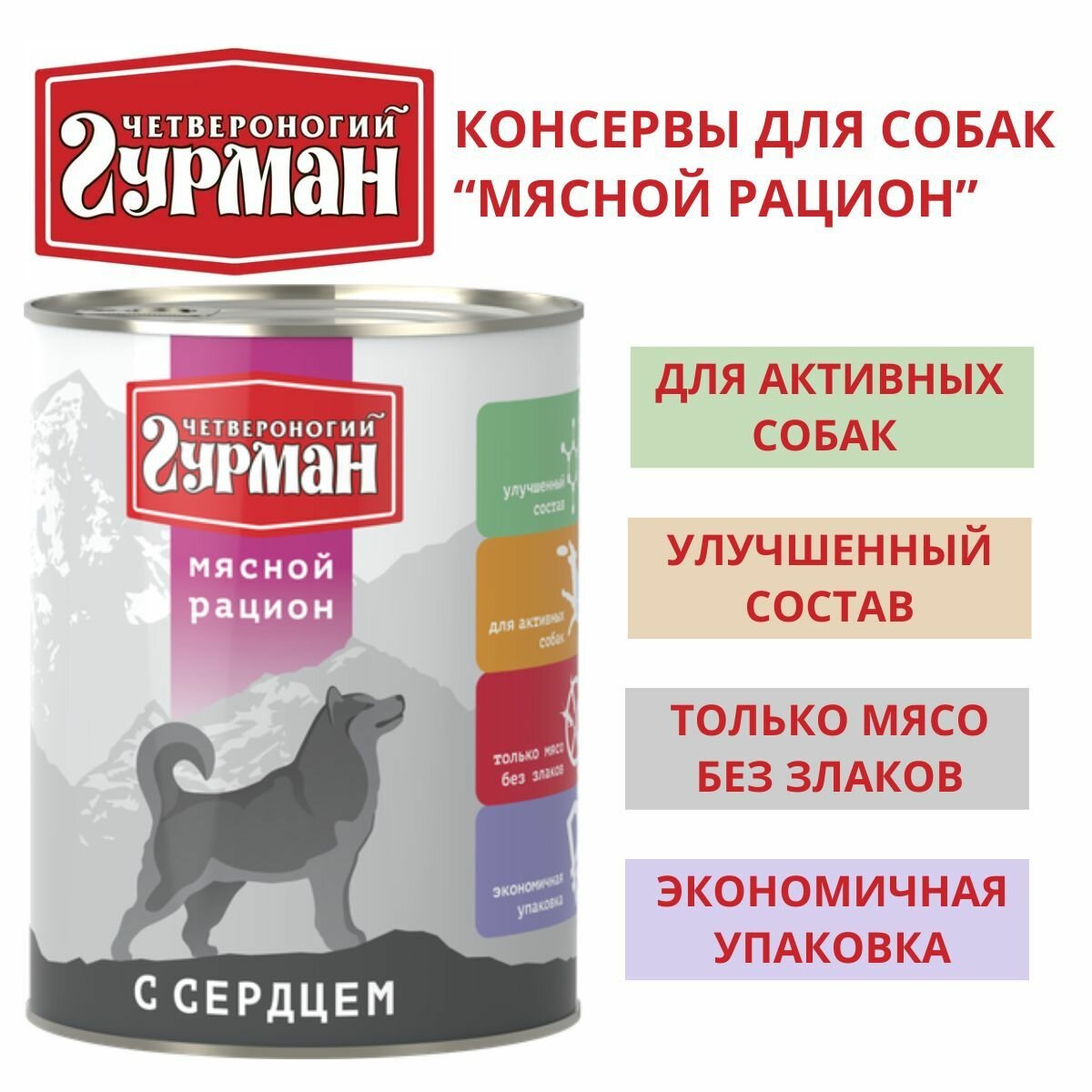 Четвероногий Гурман Мясной рацион консервированный корм премиум класса с сердцем для собак - 850 г х 6 шт